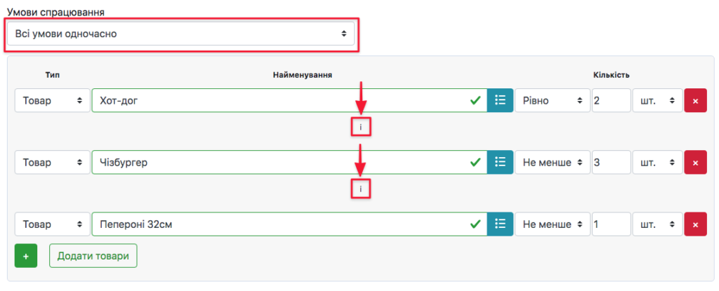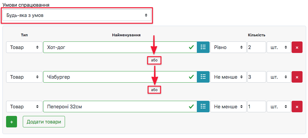 Будь-яка з умов → товари, які будуть обрані нижче, викликатимуть спрацювання акції не залежно один від одного. Кожен товар буде опиратись на свої умови.