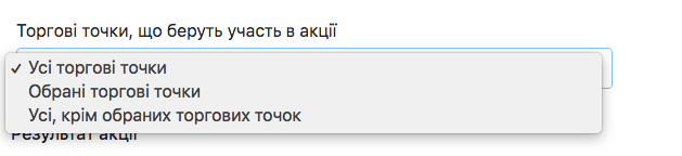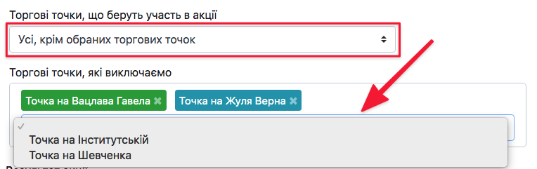 - Усі, крім обраних торгових точок – у полі, що з’явиться нижче, оберіть Торгові точки, на яких не повинна працювати акція (зручно у випадку, якщо на більшості має працювати, але не на всіх точках)