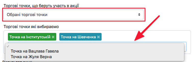 - Обрані торгові точки – у полі, що з’явиться нижче, оберіть Торгові точки, на яких має спрацьовувати дана акція