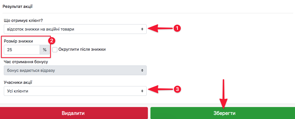 - Виберіть що отримує клієнт (бонусні товари, фіксовану ціну зі знижкою на кожен акційний товар, відсоток знижки на акційні товари)