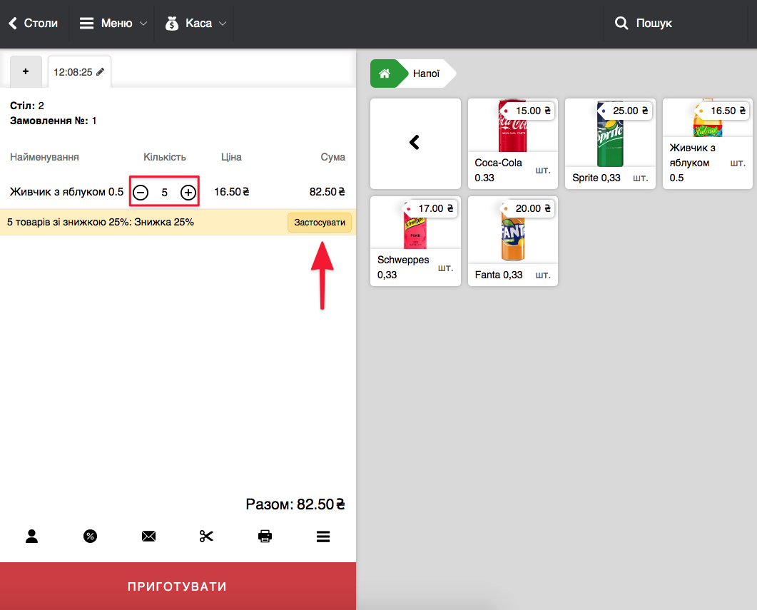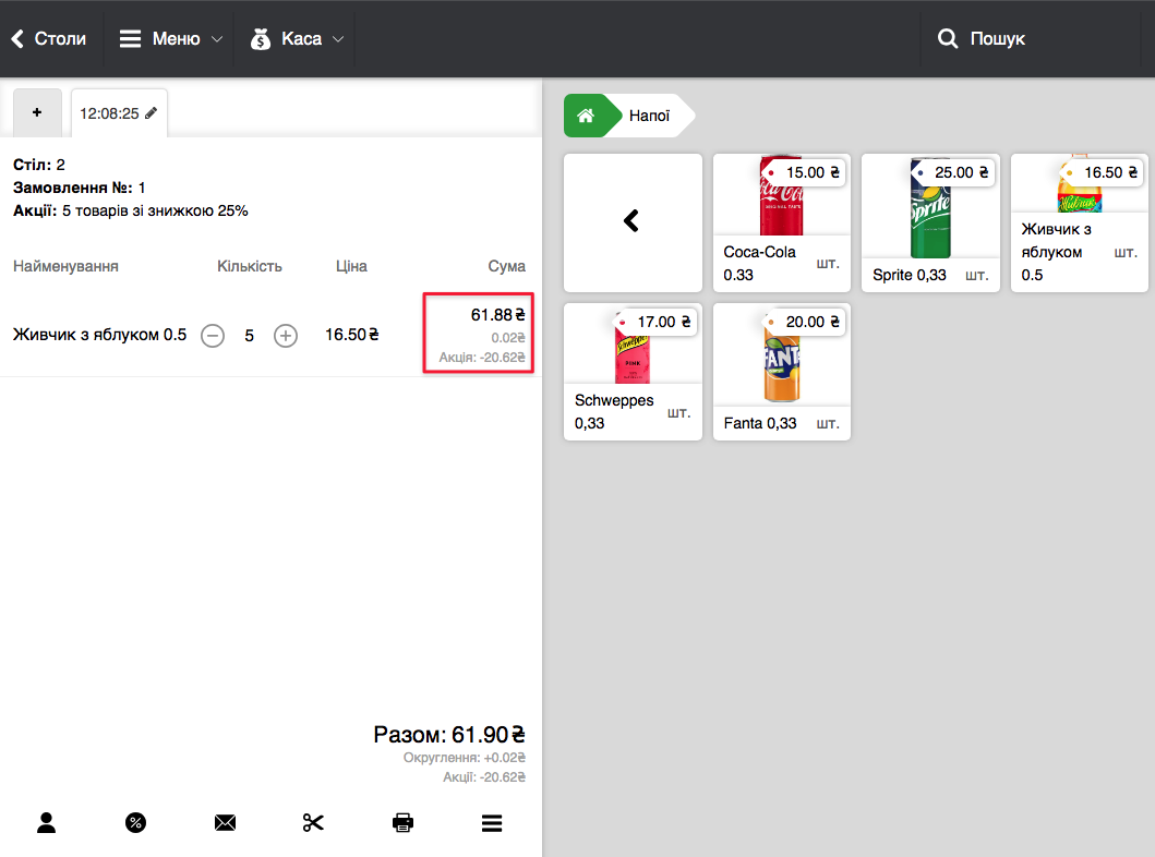 - Якщо при налаштуванні акції відмітили Застосовувати акцію автоматично, то програма одразу при додаванні необхідної кількості акційного товару, буде активовувати акцію
