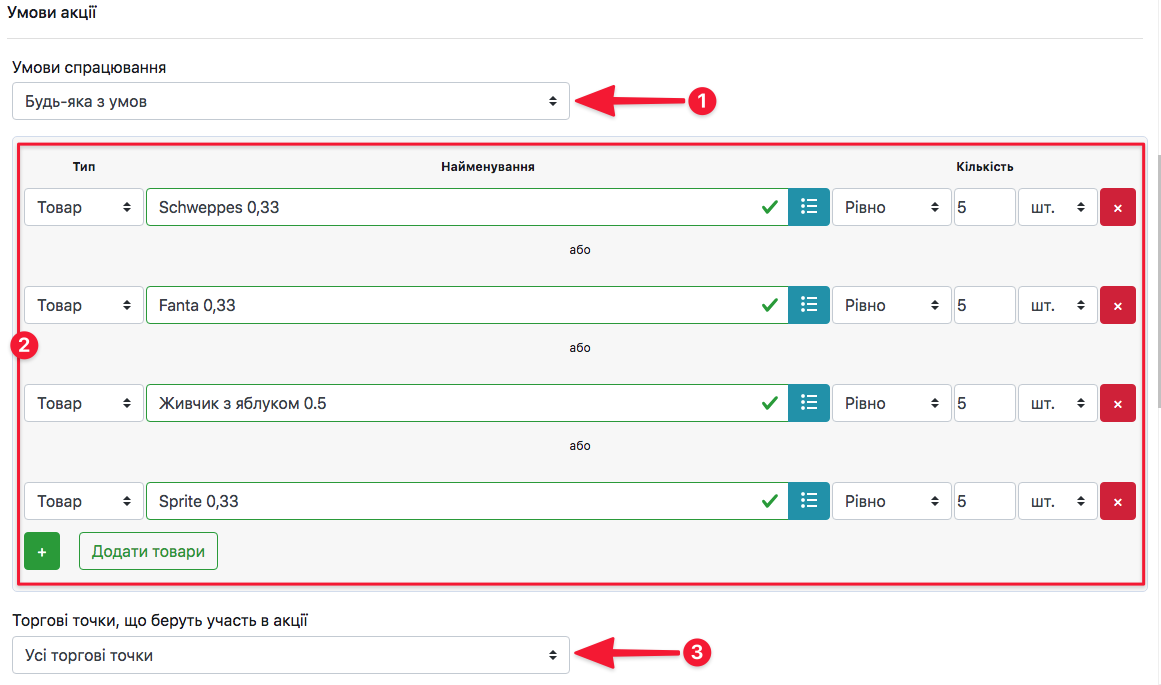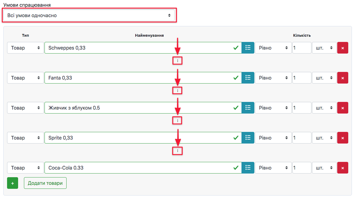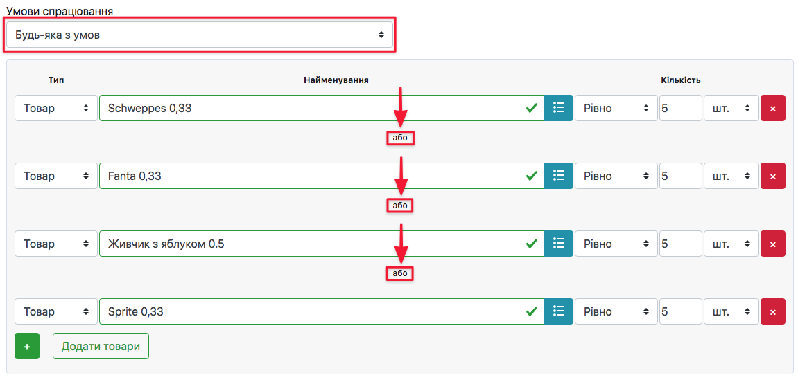 Будь-яка з умов → товари, які будуть обрані нижче, викликатимуть спрацювання акції не залежно один від одного. Кожен товар буде опиратись на свої умови.