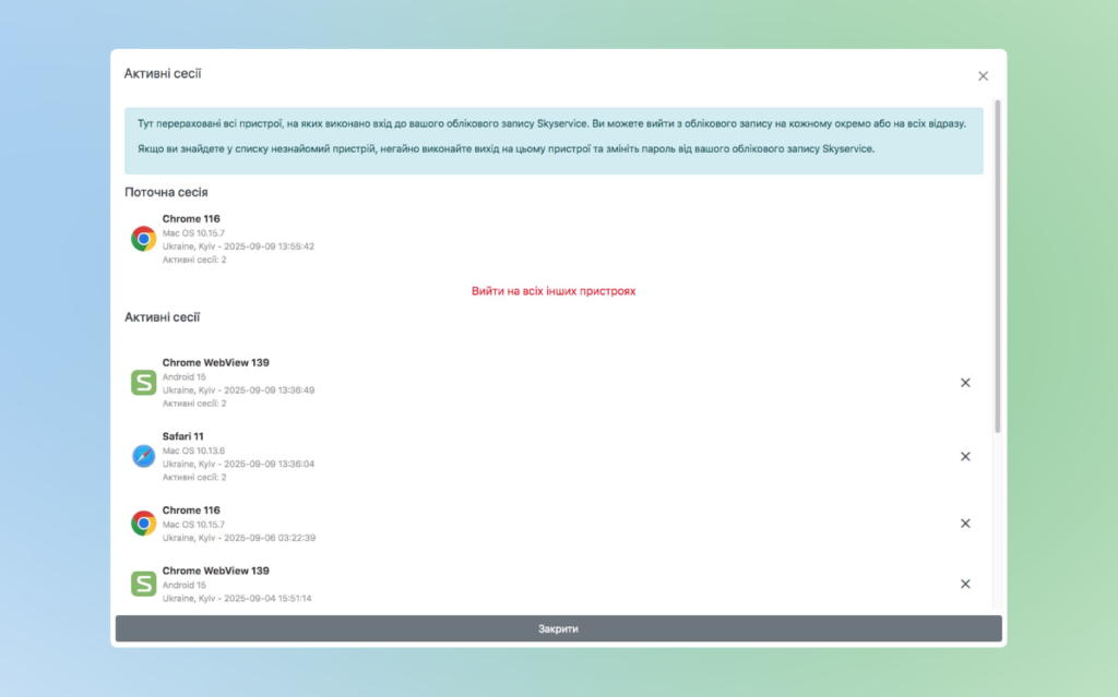 - Активні сесії – список всіх активних сесій до вашого облікового запису