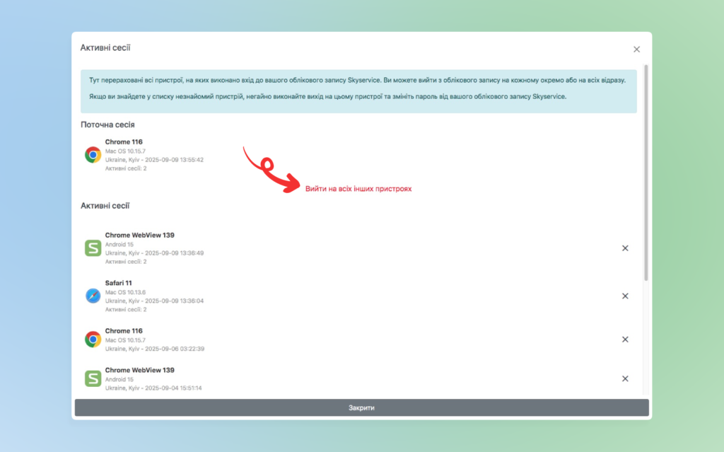 - у цьому випадку, поточна сесія залишиться активною, та сесії з блоку “Активні сесії” зникнуть