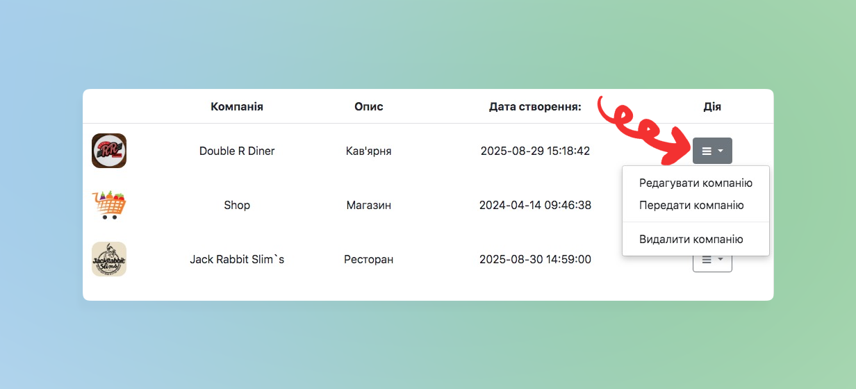 - Оберіть необхідну компанію та натисніть на кнопку з 3-а лініями у колонці Дія, та оберіть –