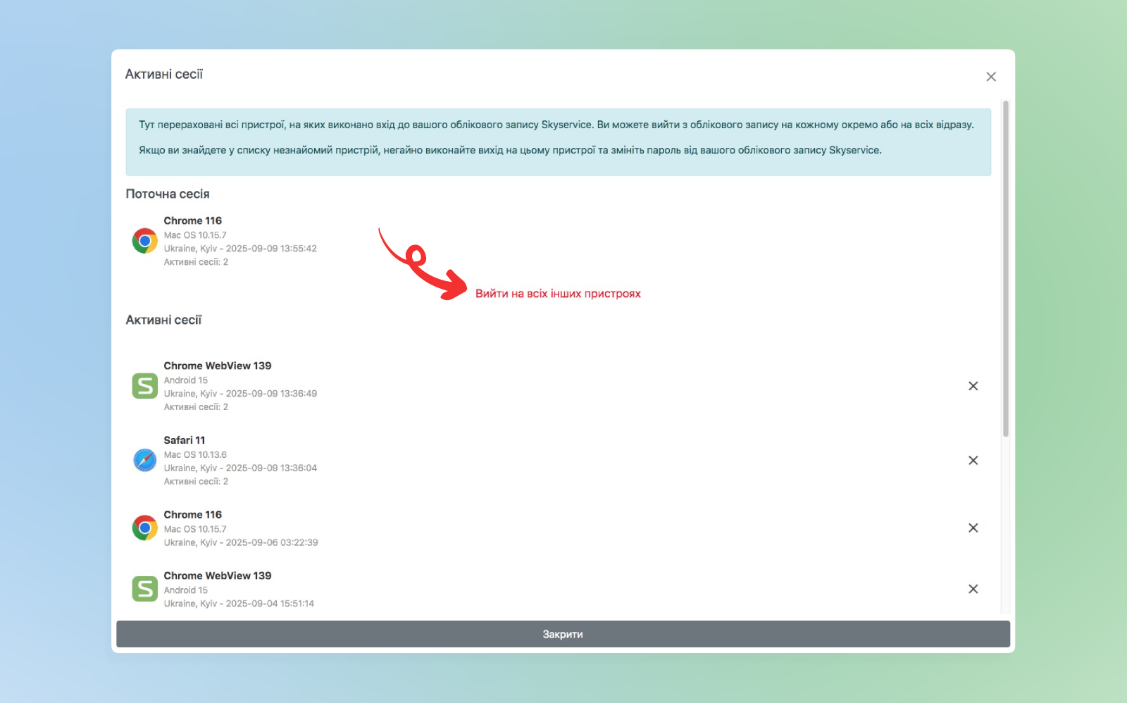 - у цьому випадку, поточна сесія залишиться активною, та сесії з блоку “Активні сесії” зникнуть