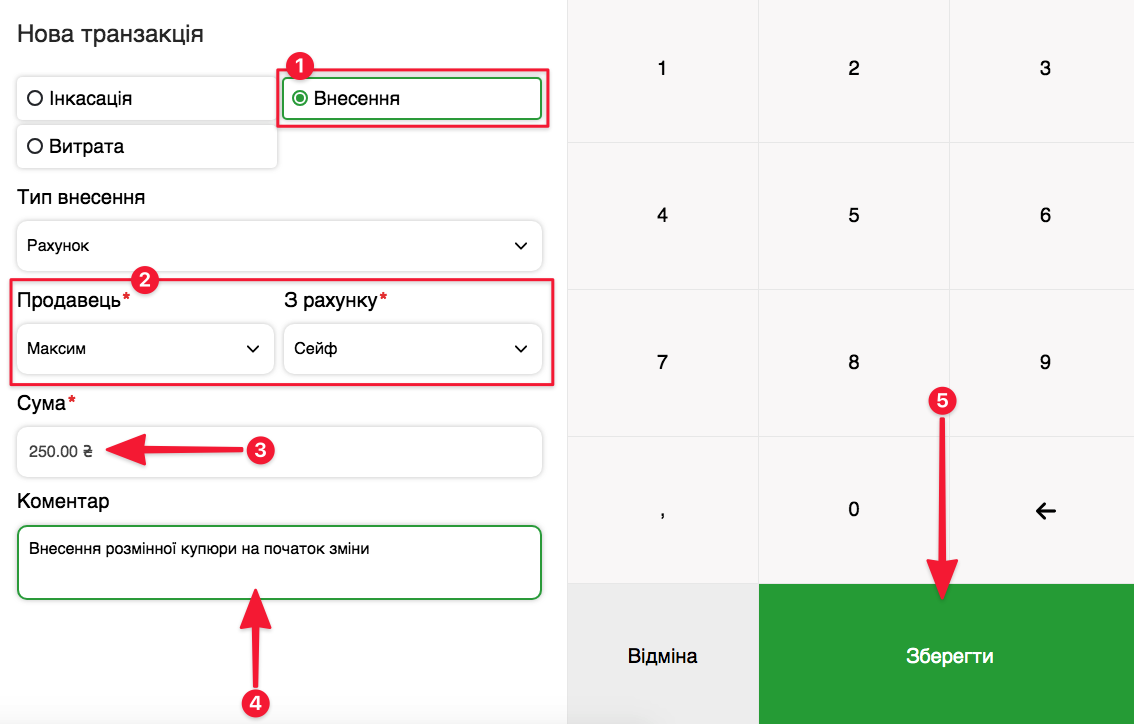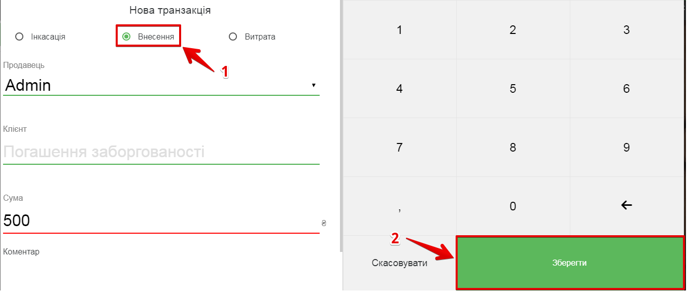 У вікні Нова транзакція натискаємо Внесення, вводимо потрібну суму грошових коштів і натискаємо Зберегти