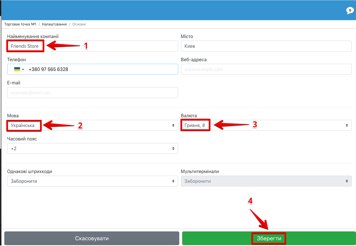 - Валюта – символ обраної валюти відображатиметься по усім операціям з коштами в межах компанії;