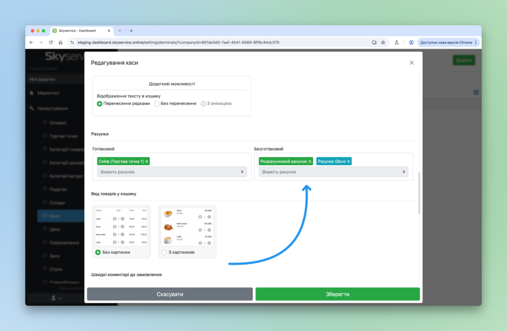 - Виберіть необхідні рахунки до каси