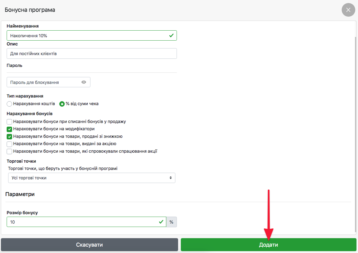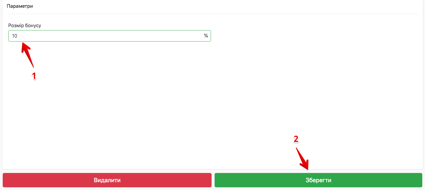 - У блоці ” Параметри ” в поле Розмір бонусу введіть відсоток бонусу (цей відсоток від чека отримає клієнт на свій бонусний баланс)