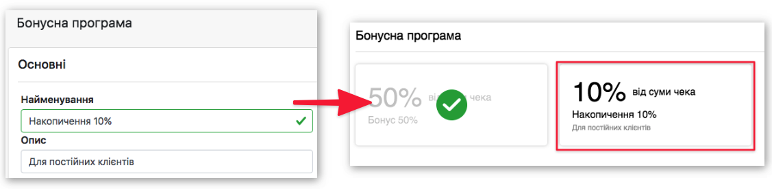 - % від суми чеку – сума бонусу розраховуватиметься та нараховуватиметься на баланс клієнту автоматично залежно від суми замовлення та вказаного вами % в налаштуванні Бонусної програми.