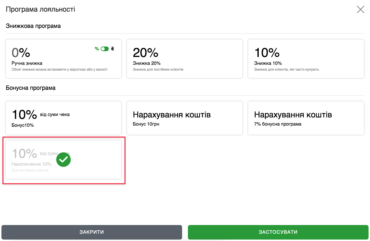 👉 В POS-терміналі буде відповідно виводитись цей опис при виборі бонусної програми. Також, у випадку необхідності, при формуванні замовлення, ви можете переключити бонусну програму вашому клієнту.