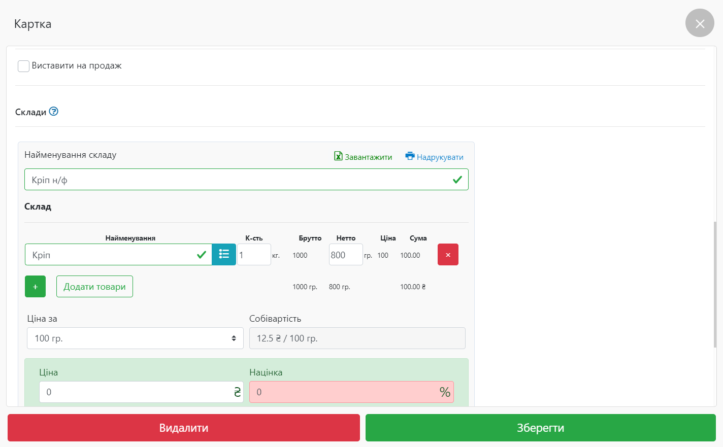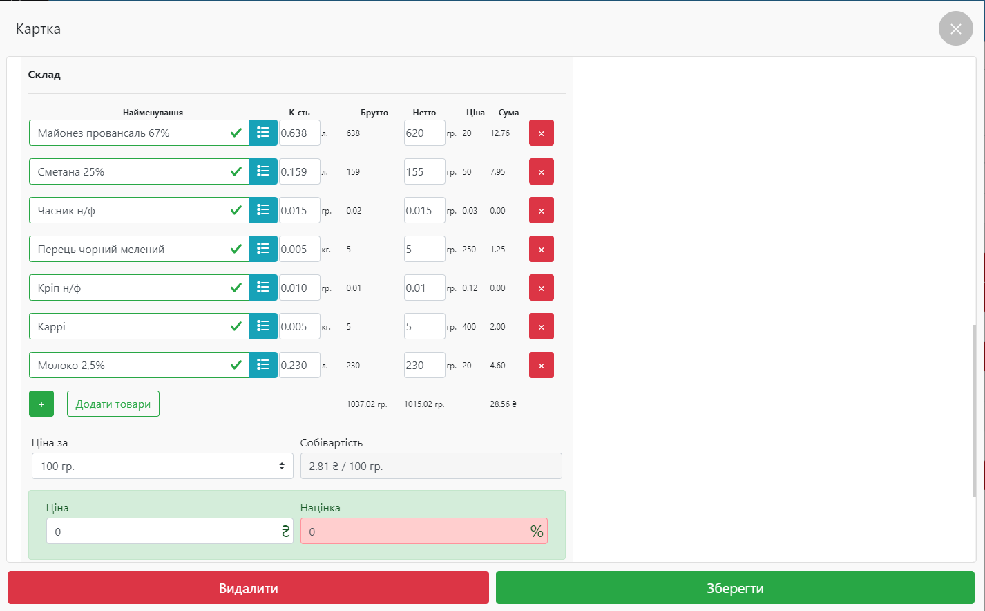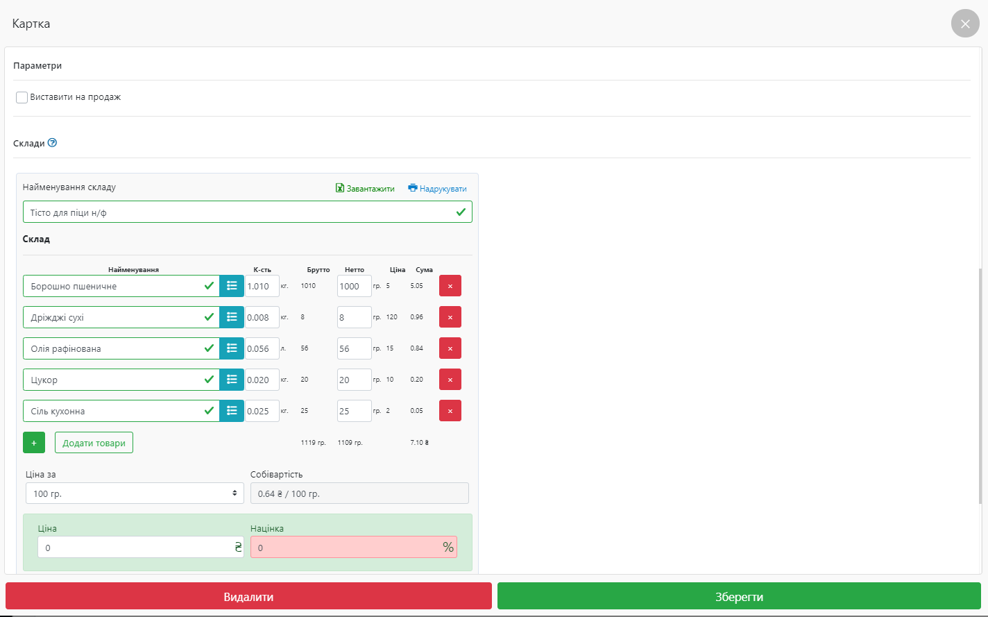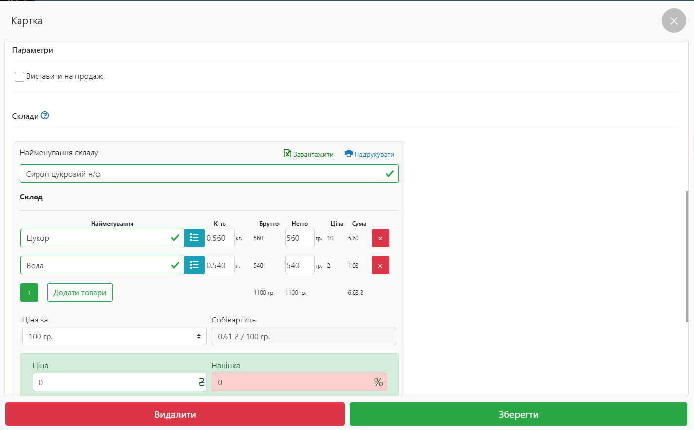 - Поля Собівартість і Націнка розраховуються автоматично при додаванні інгредієнтів на склад з вказуванням собівартості.