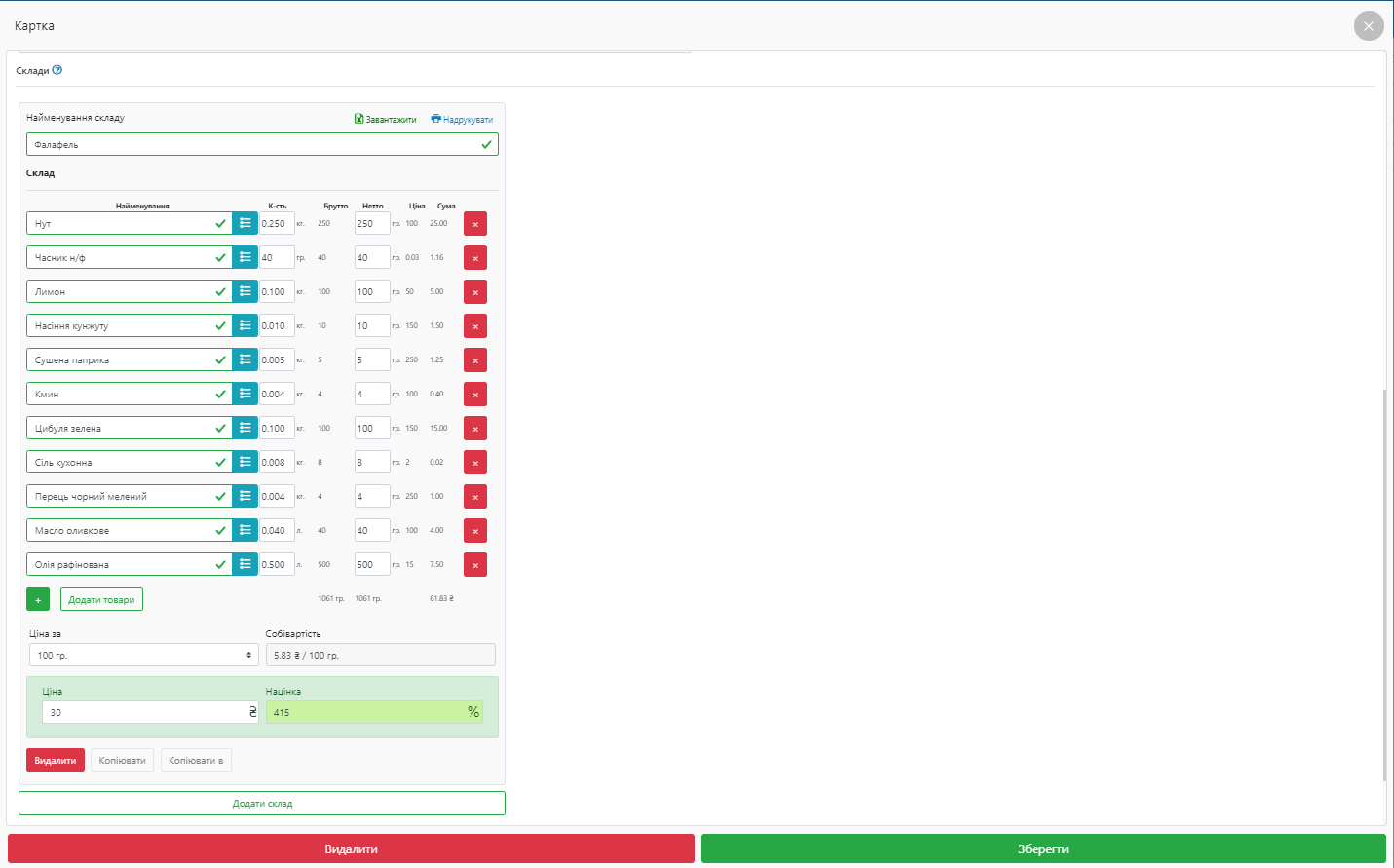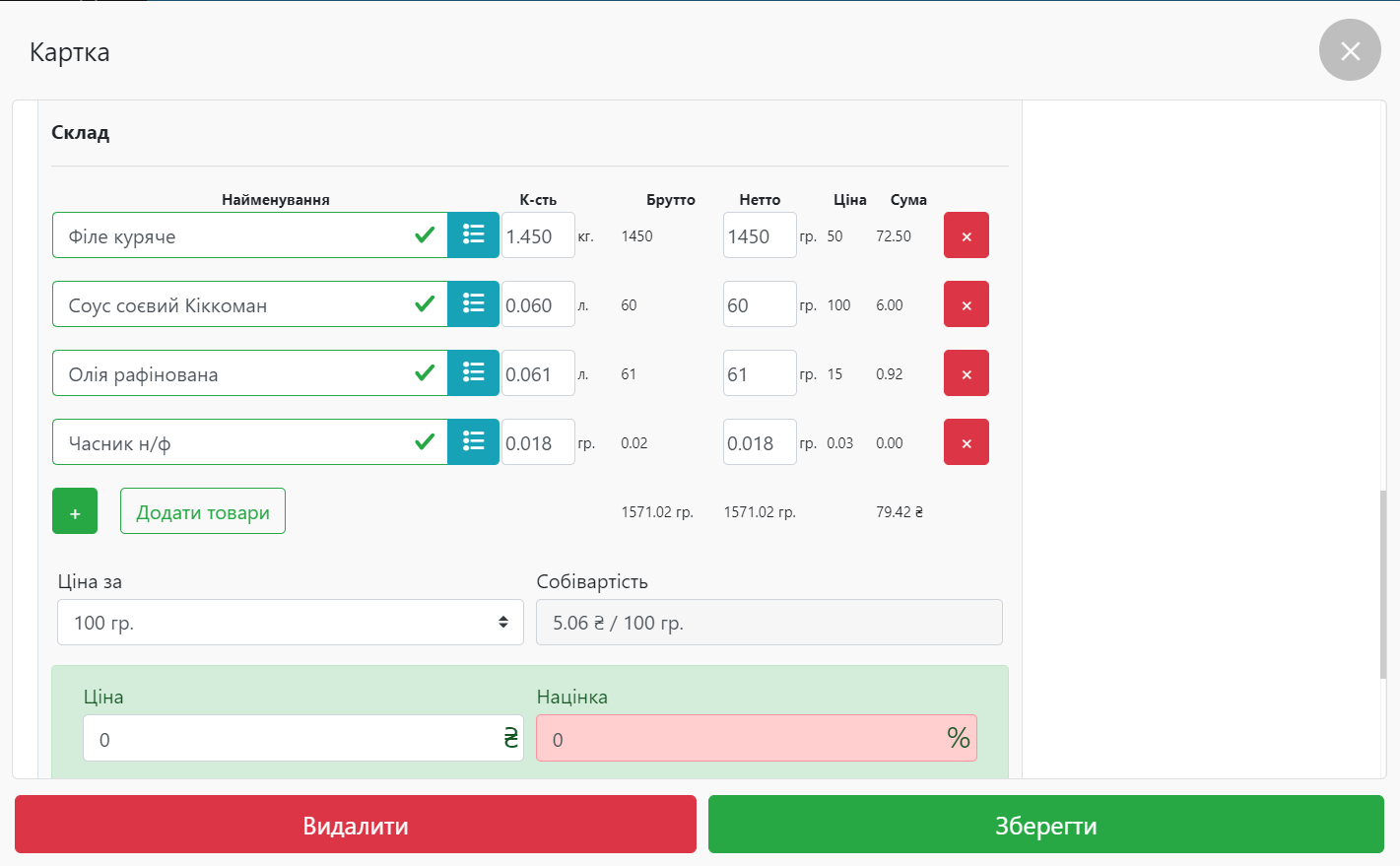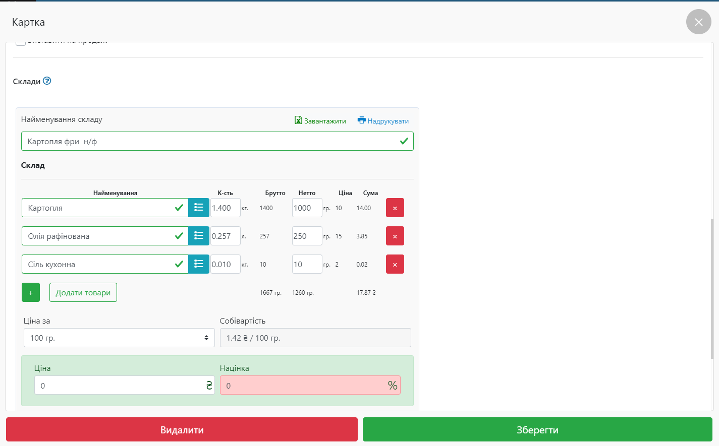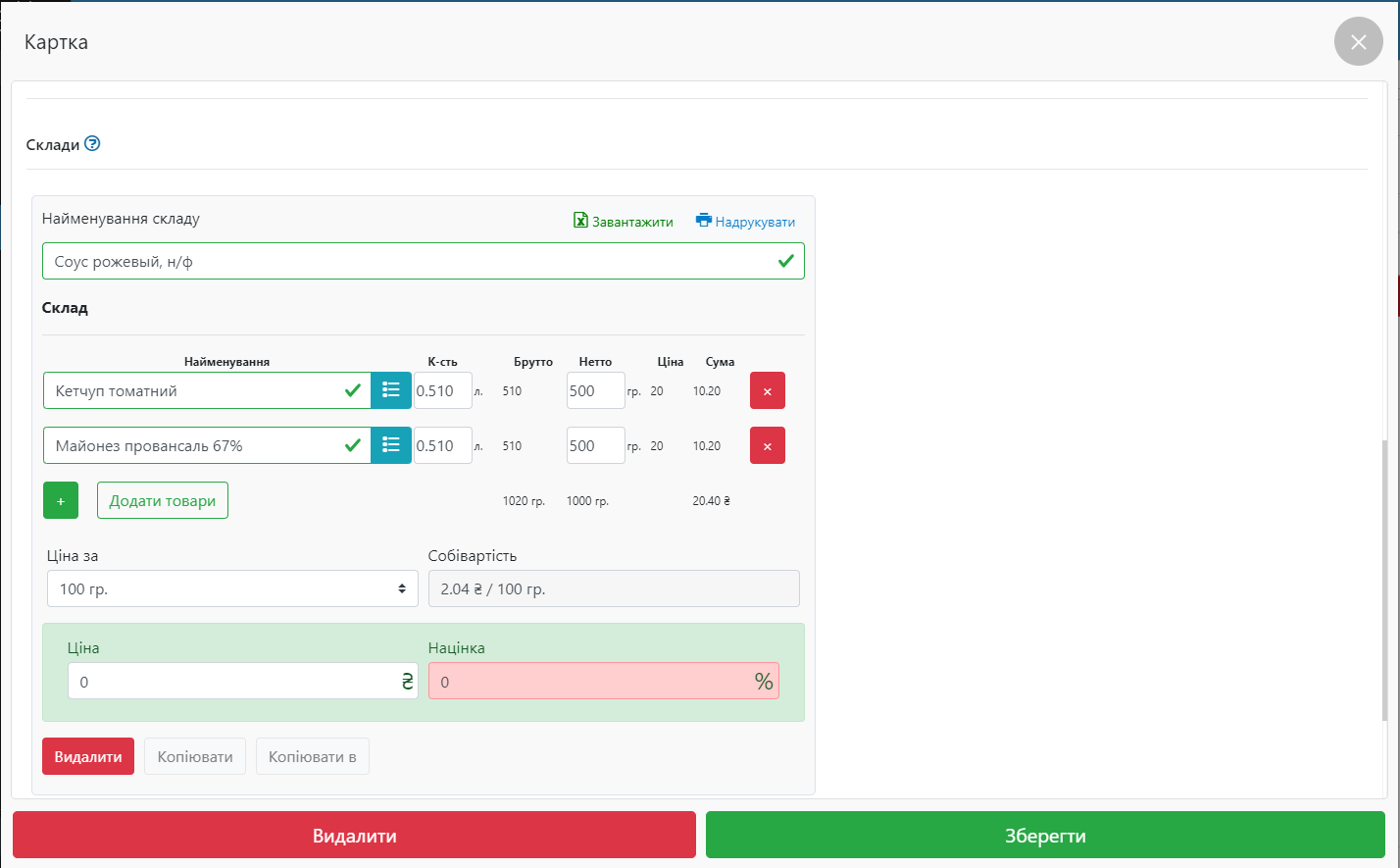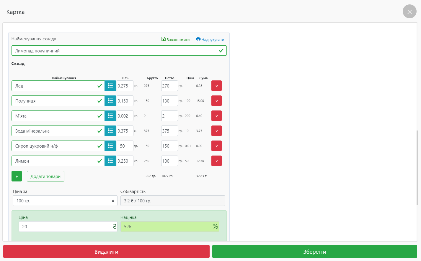 - Поля Собівартість і Націнка розраховуються автоматично при додаванні інгредієнтів на склад з вказуванням собівартості.
