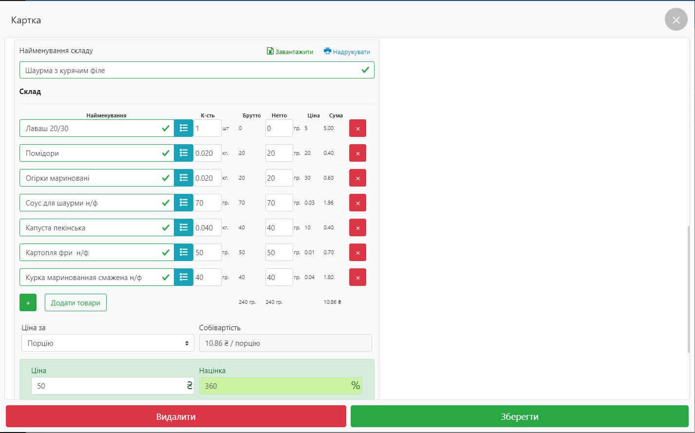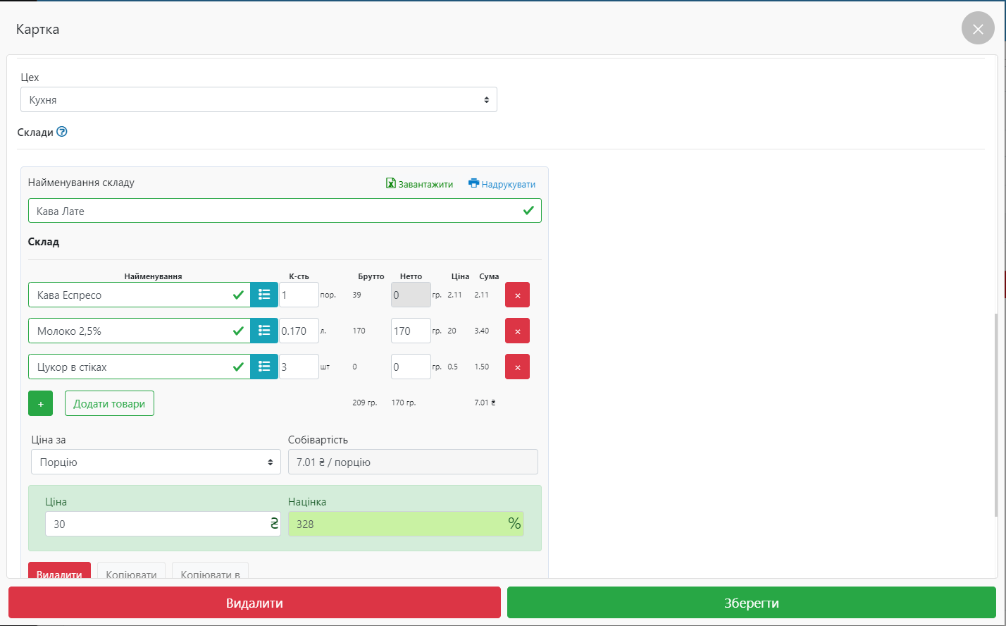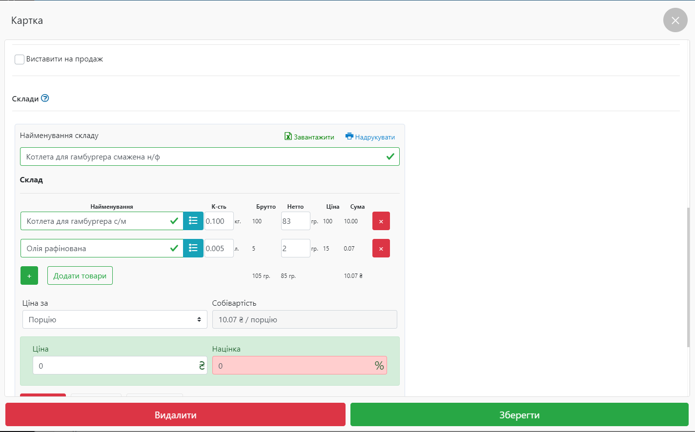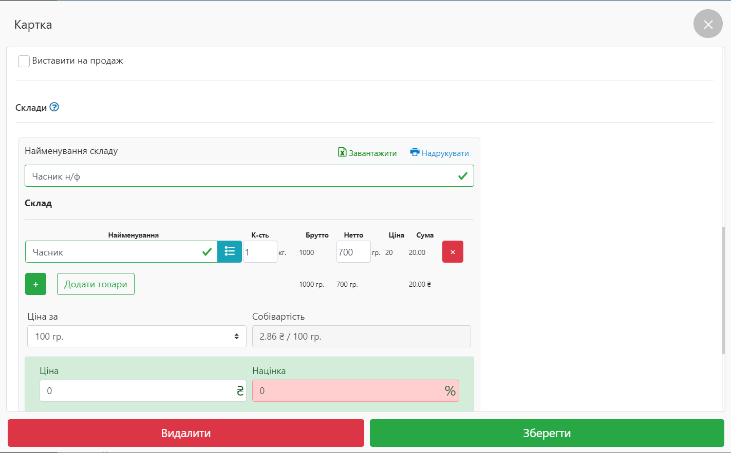 - Поля Собівартість і Націнка розраховуються автоматично при додаванні інгредієнтів на склад з вказуванням собівартості.