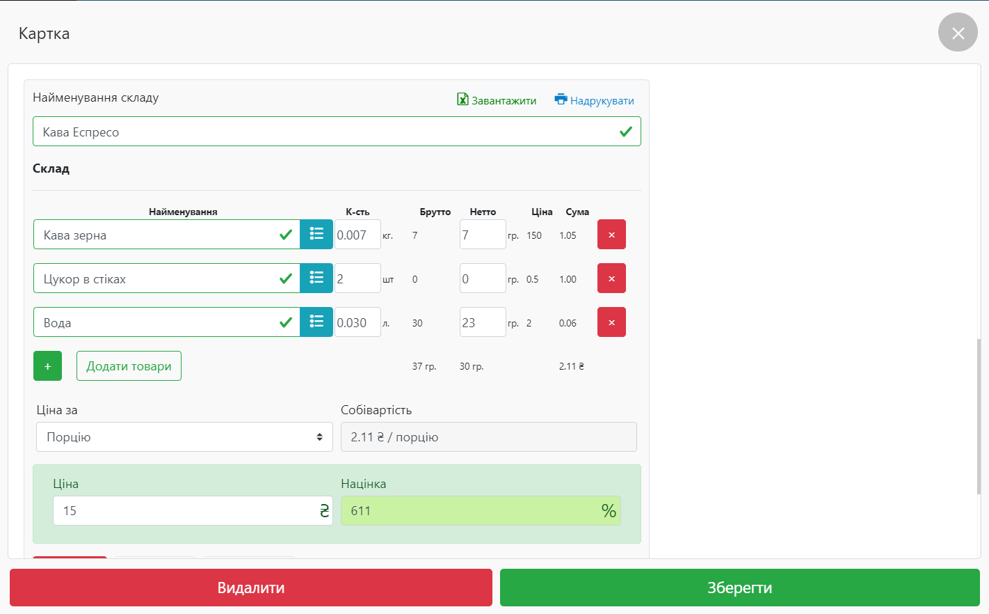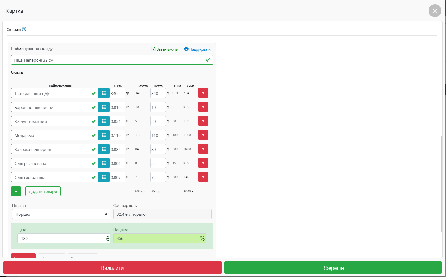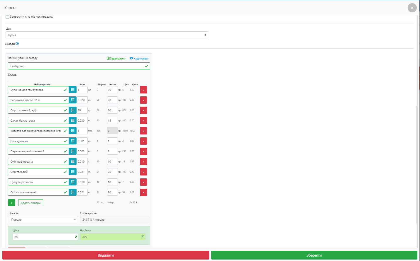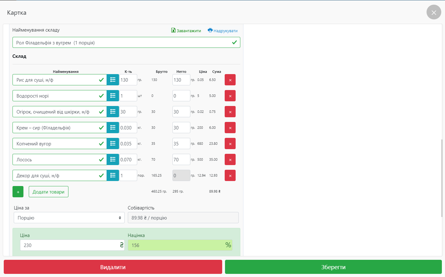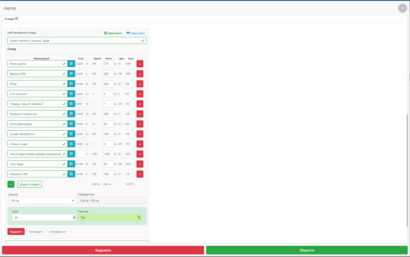 - Поля Собівартість і Націнка розраховуються автоматично при додаванні інгредієнтів на склад з вказуванням собівартості.