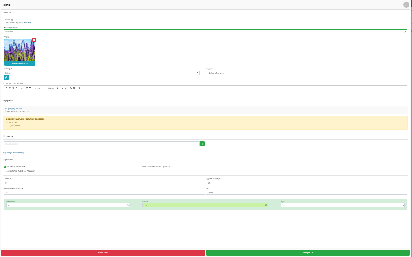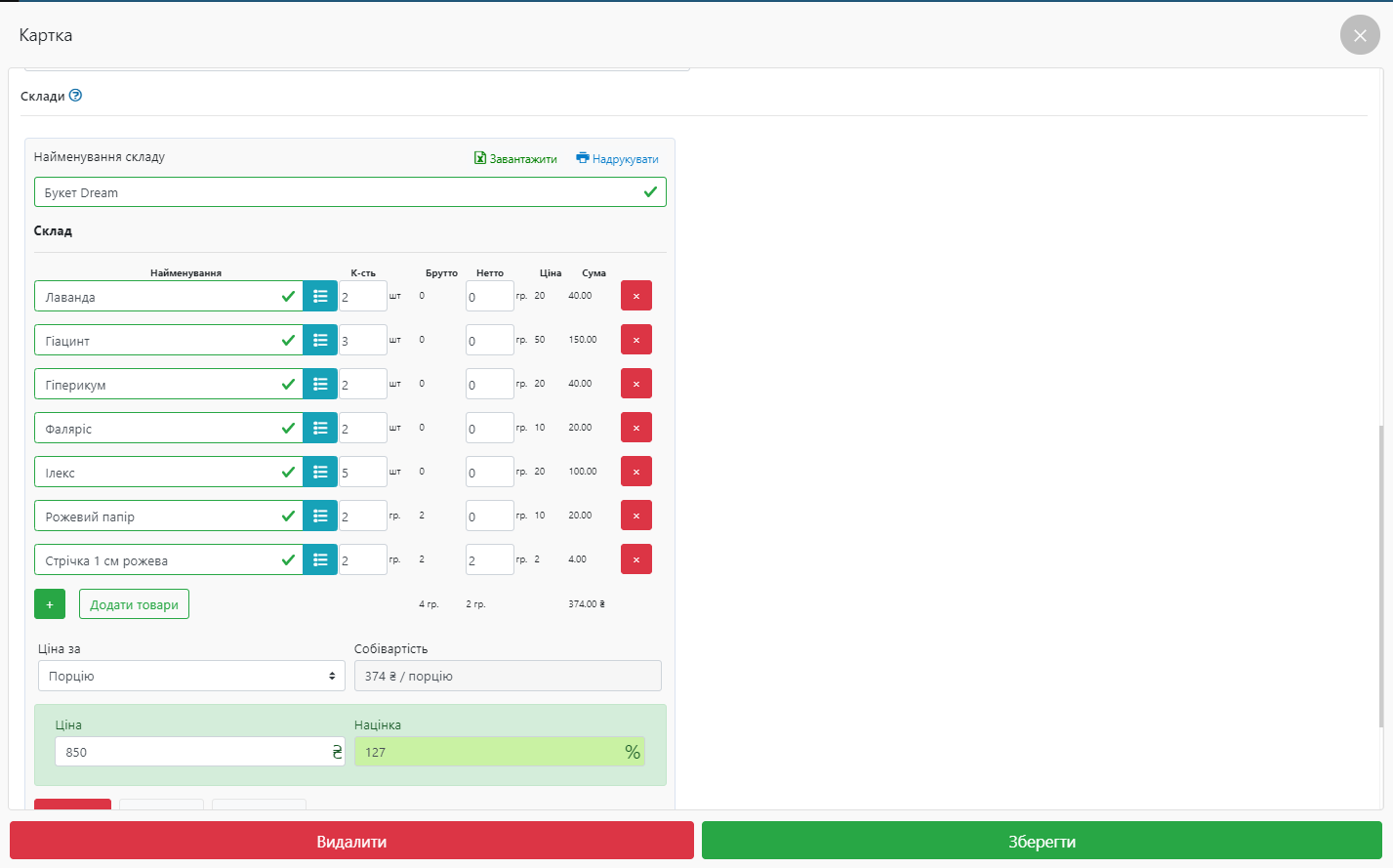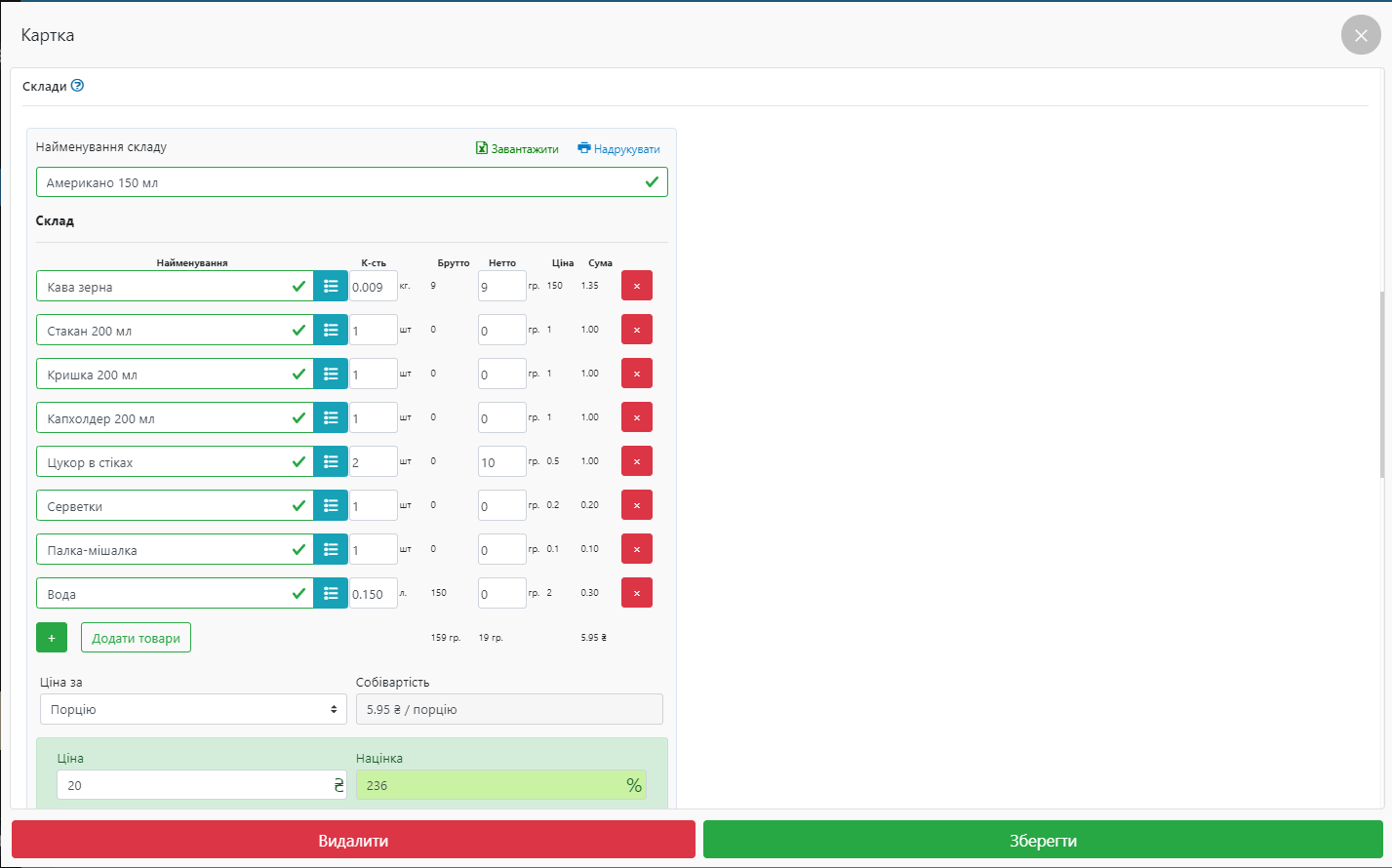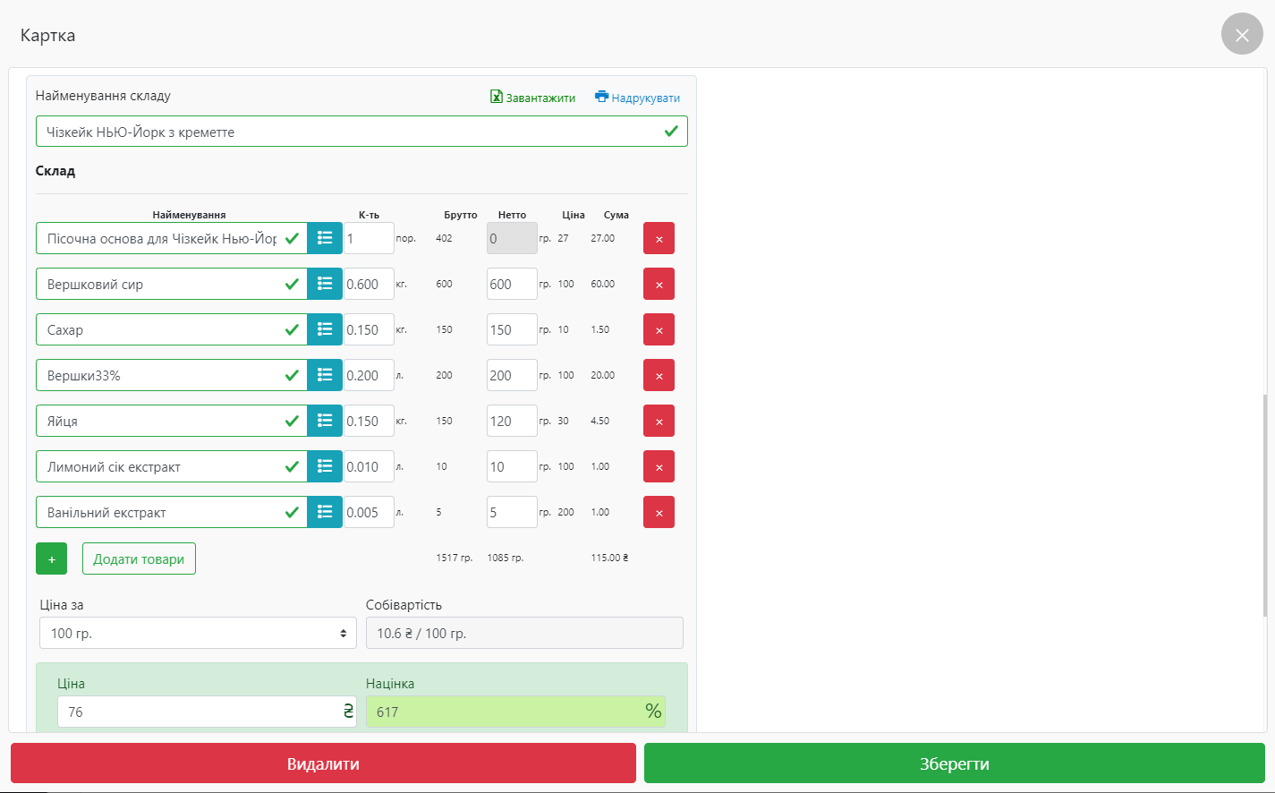 - Поля Собівартість і Націнка розраховуються автоматично при додаванні інгредієнтів на склад з вказуванням собівартості.