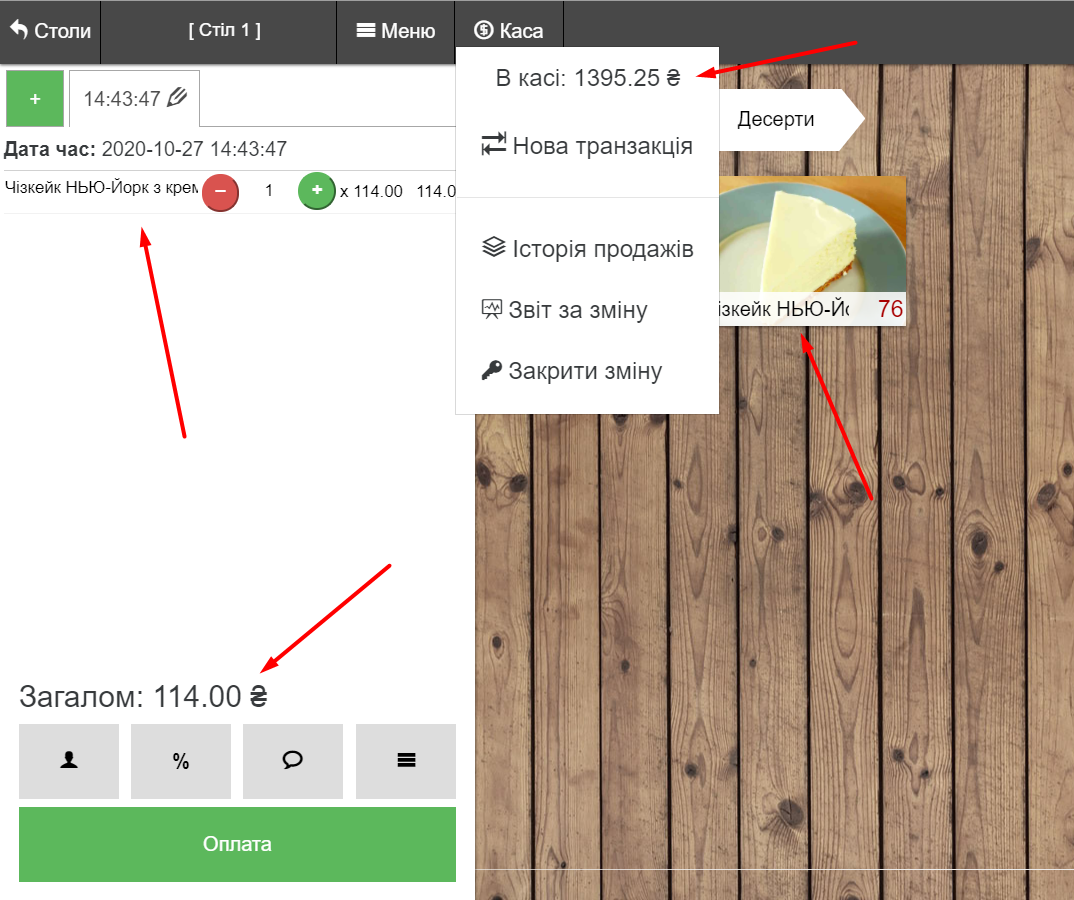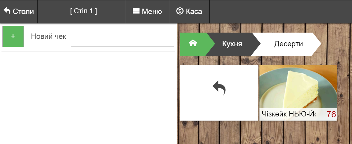 - В Пос-терміналі знаходим в категорії “Кухня” – підкатегорії “Десерти” страву і проводимо продаж “Чізкейк Нью-Йорк с креметте”;