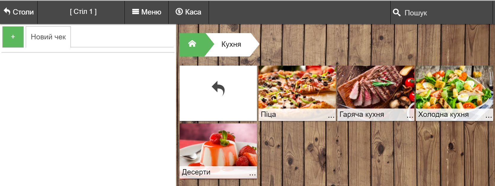 - Виходимо в Пос-термінал, знаходимо в нашій категорії Кухня, підкатегорію Десерти і обираємо потрібний нам товар/тех. карту