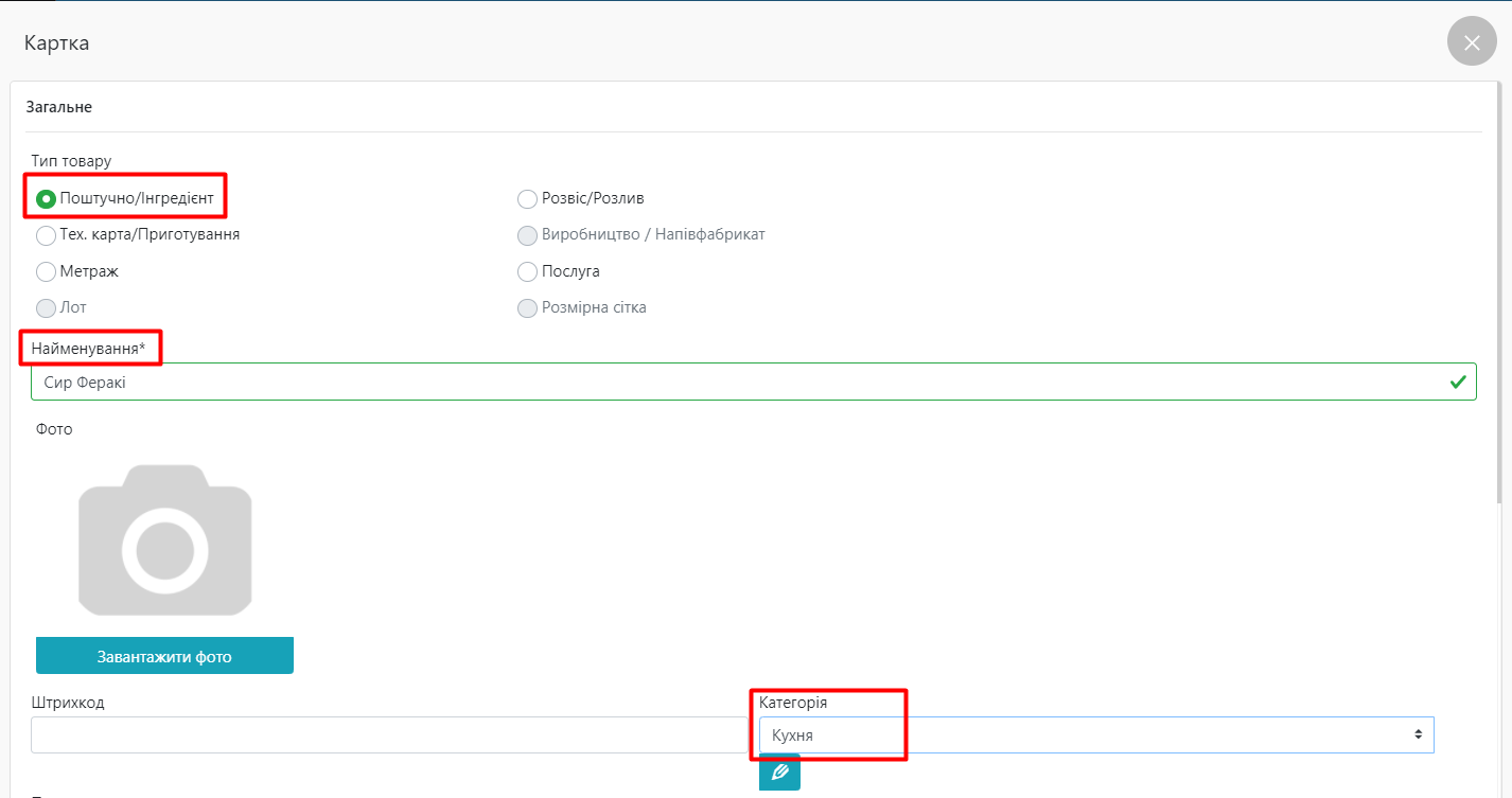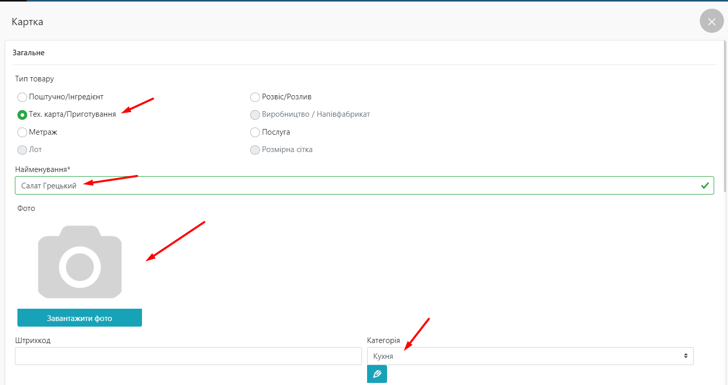 - Введіть Найменування, виберіть Категорію і вкажіть Цех, де буде готуватись страва.