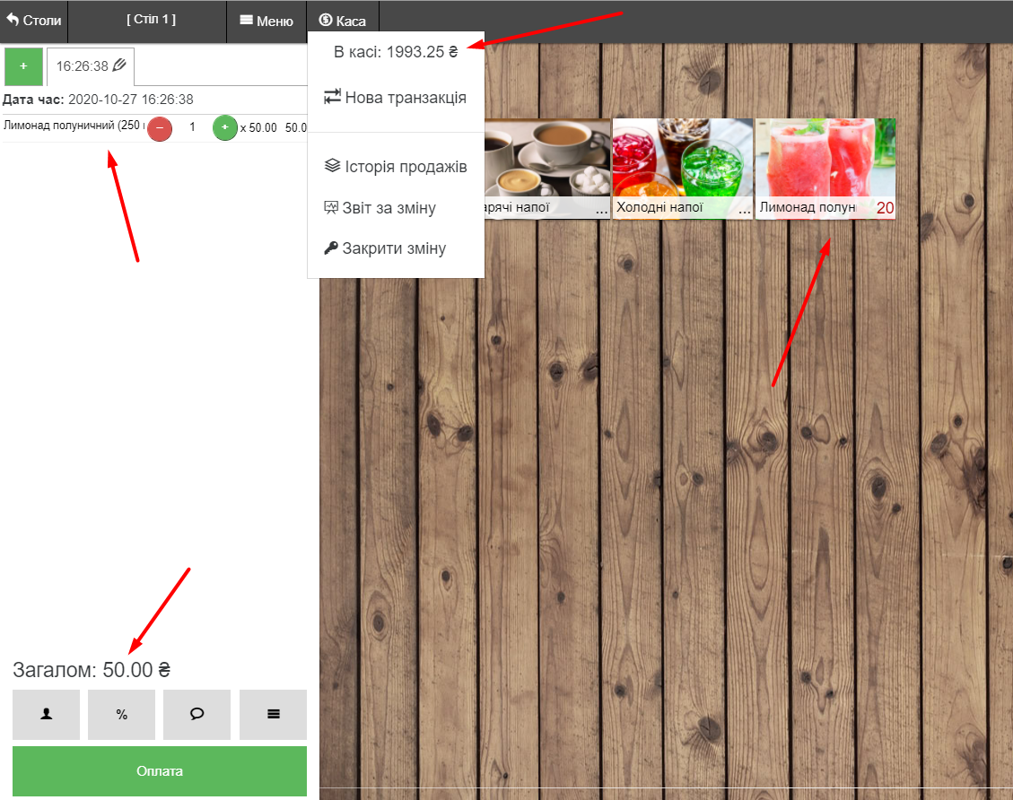 - В Пос-терміналі перейдіть в категорію “Кухня“, підкатегорію “Холодна кухня” натисніть на страву і проведіть продаж “Салат Грецький”