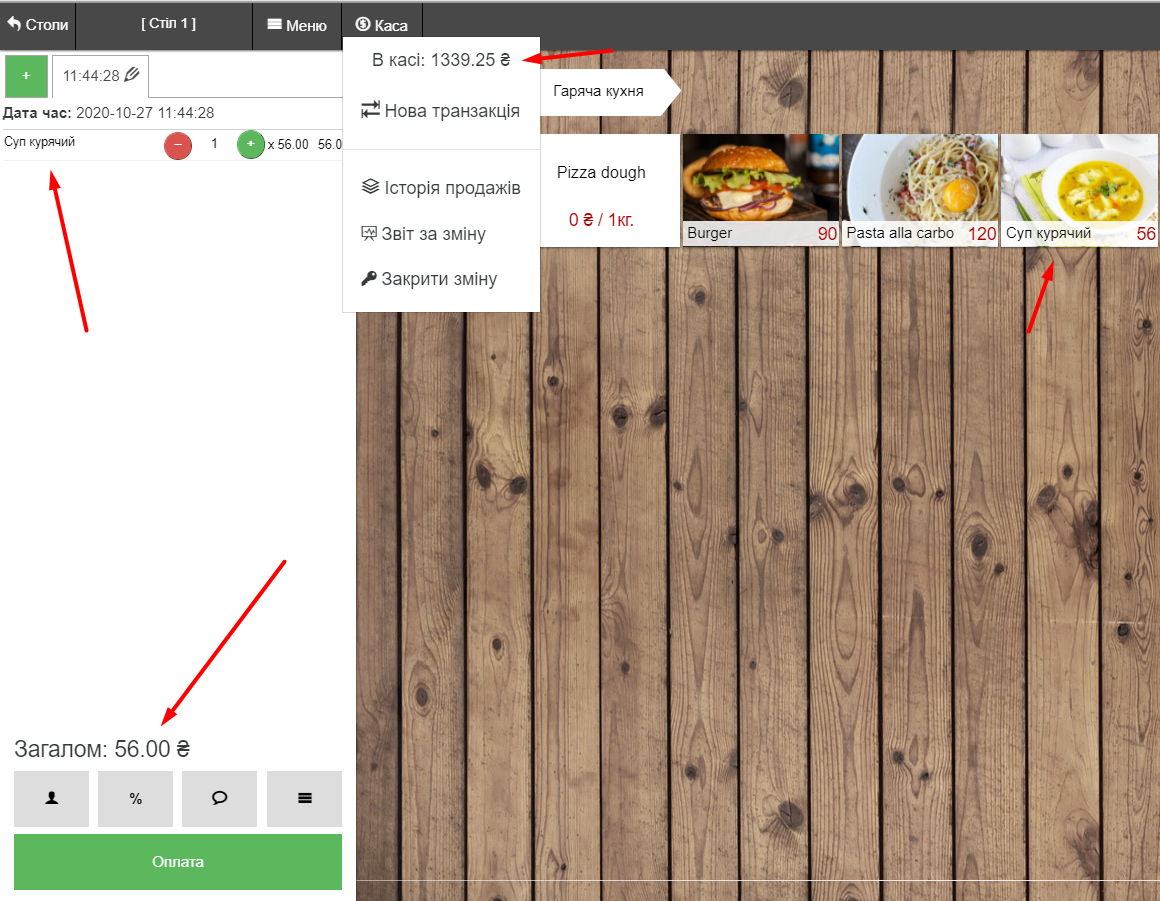 - В Пос-терміналі знаходимо в категорії “Кухня” – підкатегорії “Гаряча кухня” страву і проводимо продаж “Суп курячий”