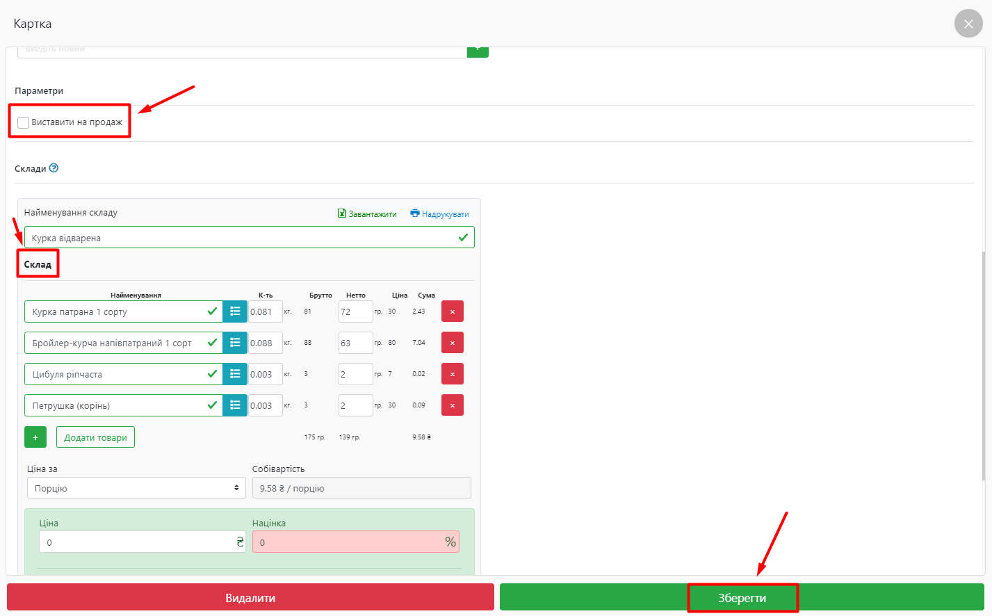 - Ставимо галочку Виставити на продаж, підтягуємо всі необхідні інгредієнти і технологічні карти інгредієнти.