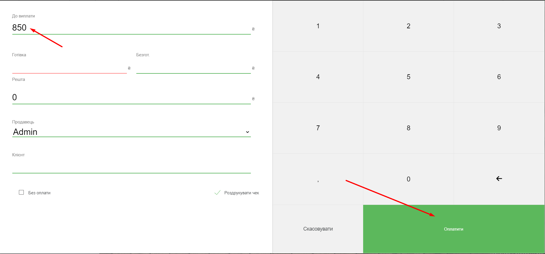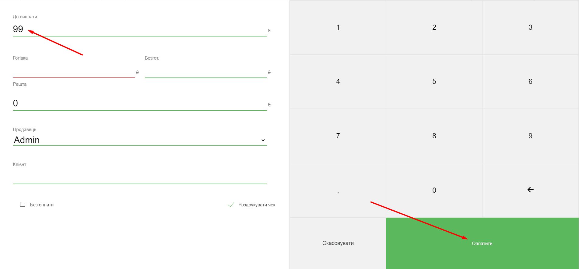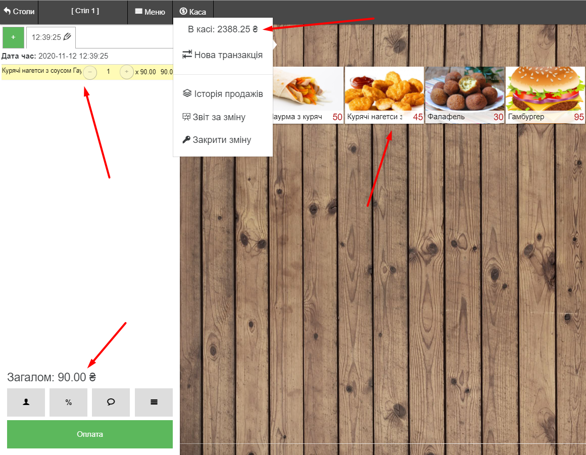 - Де можна переглянути касу до операції 90.00, і сформувати чек з підсумковою сумою.
