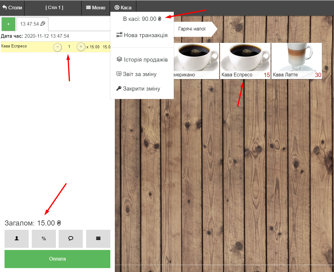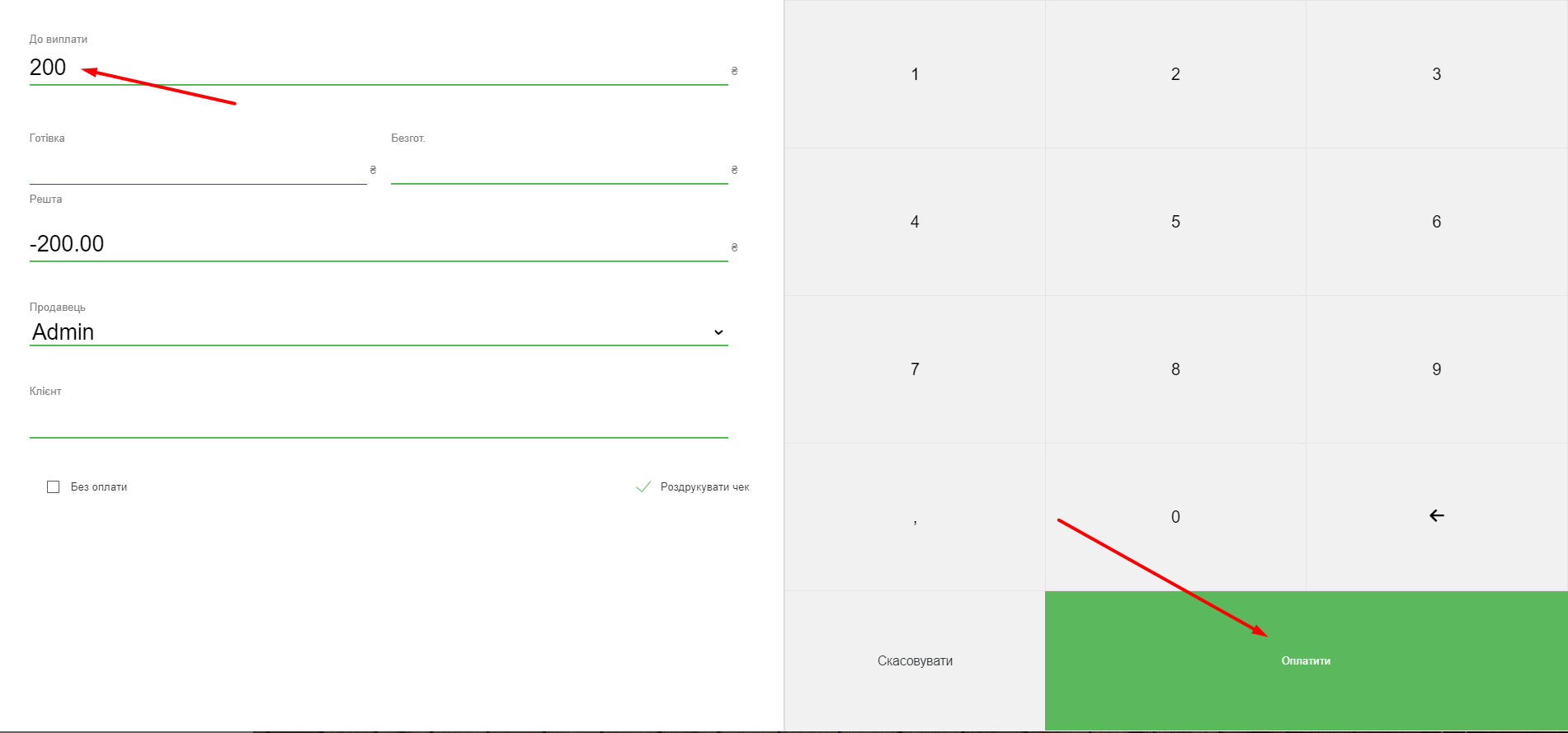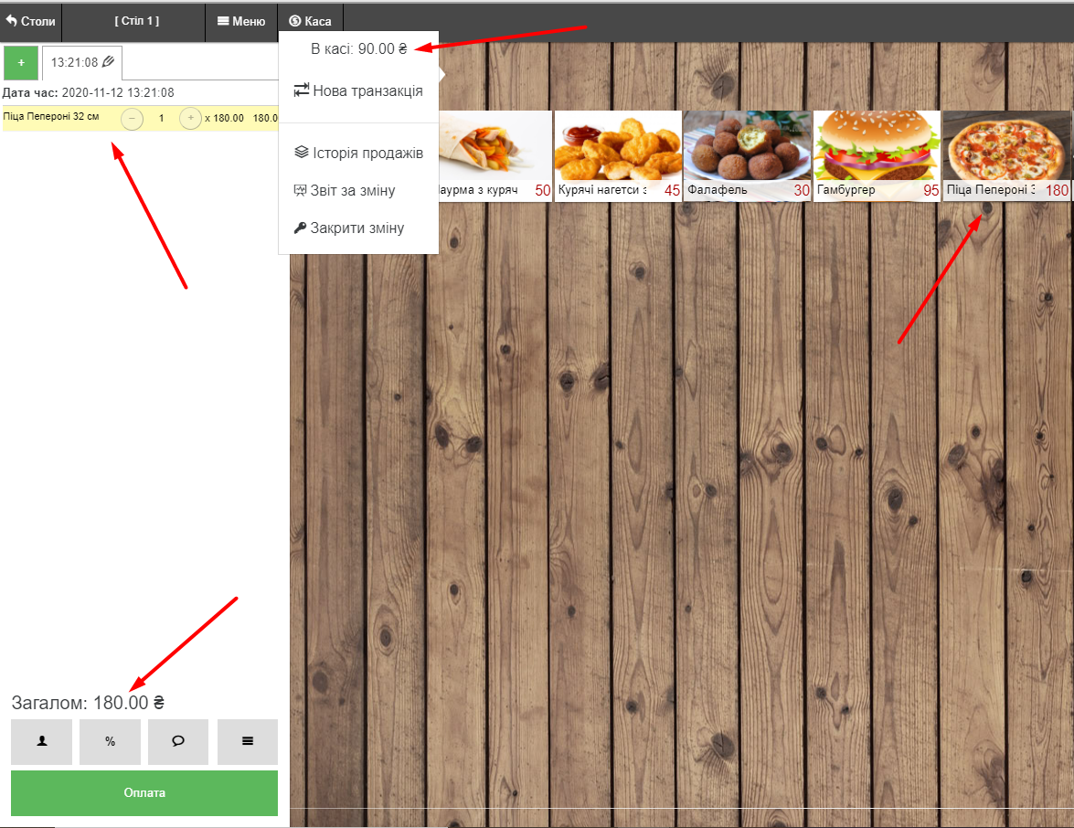 - Де можна переглянути касу до операції 90.00, і сформувати чек з підсумковою сумою.