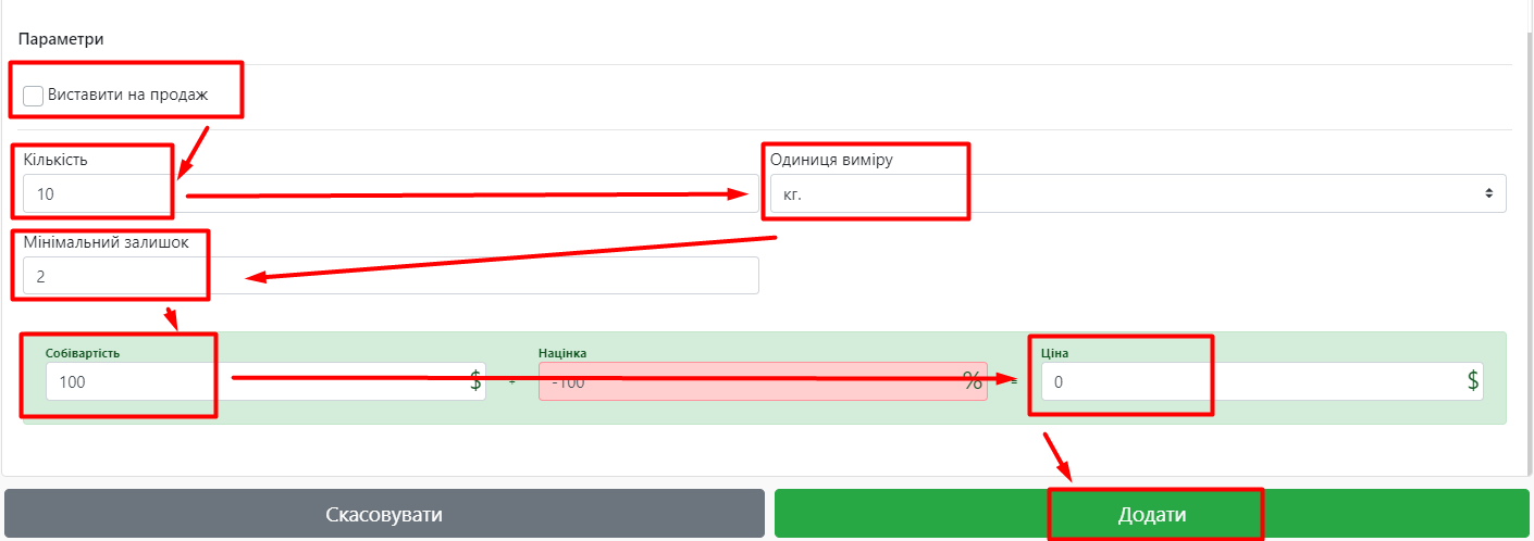 - Прибираємо галочку Виставити на продаж, так як це інгредієнт для подальших Технологічних карт.