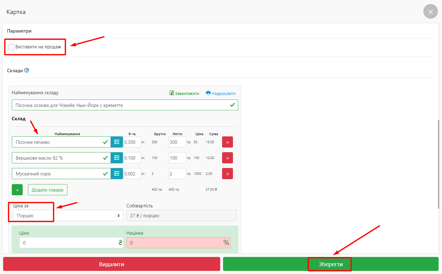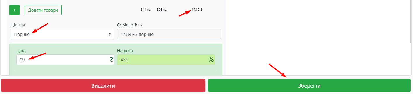 - Встановлюємо ціну за порцію і натискаємо кнопку Зберегти.