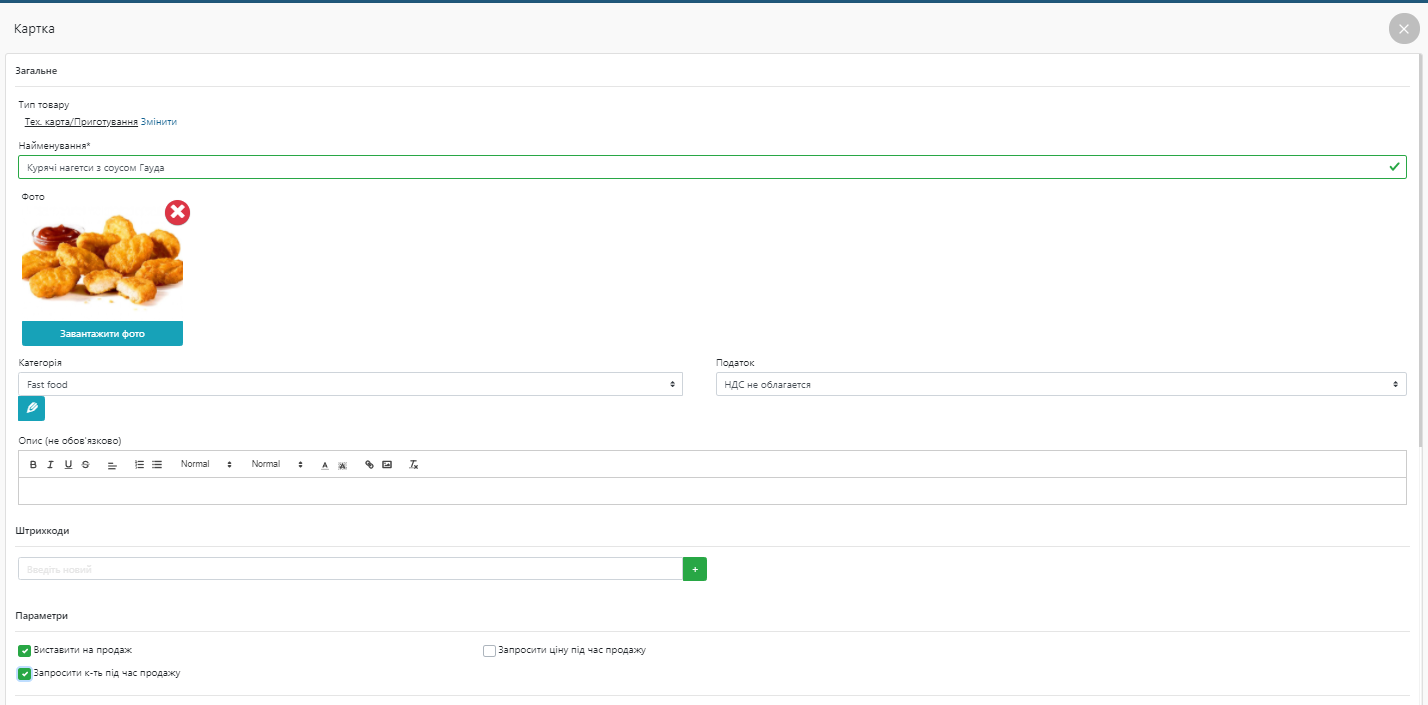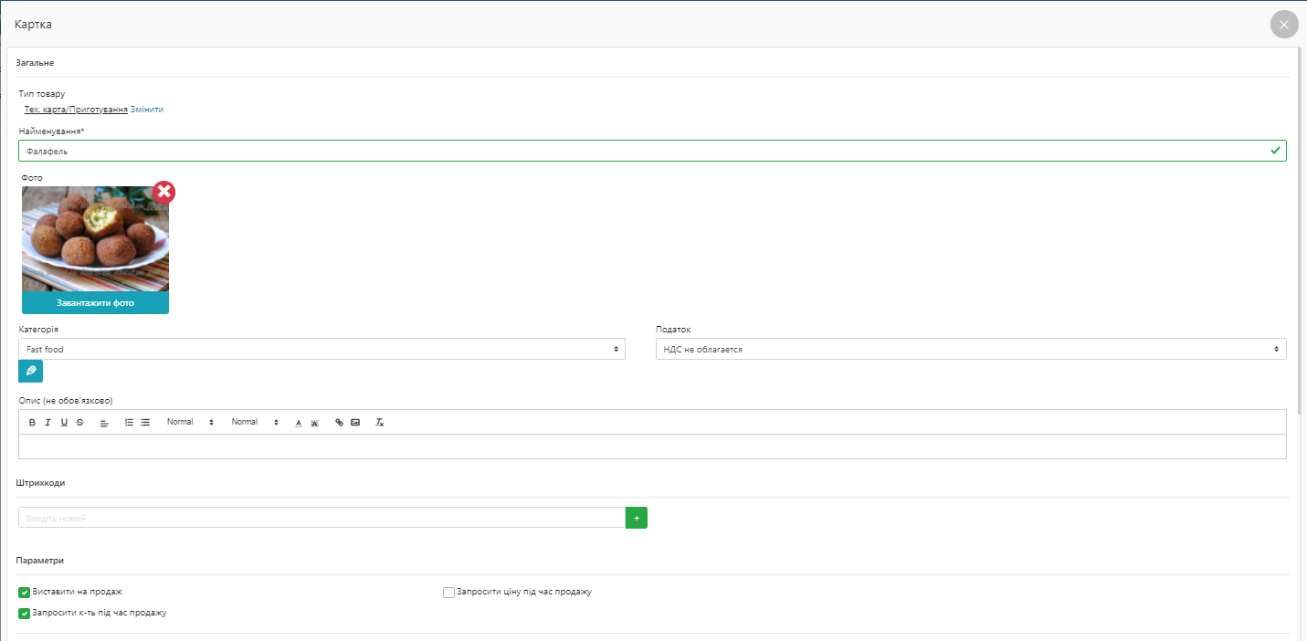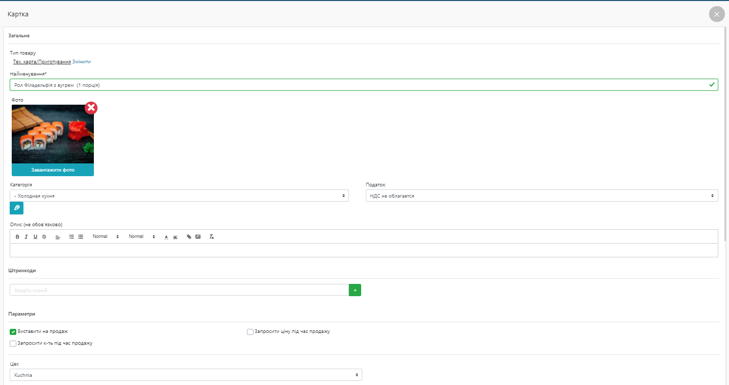 - Завантажте фотографію страви яка буде відображатись в Пос-терміналі і ставите галочку Виставити на продаж.