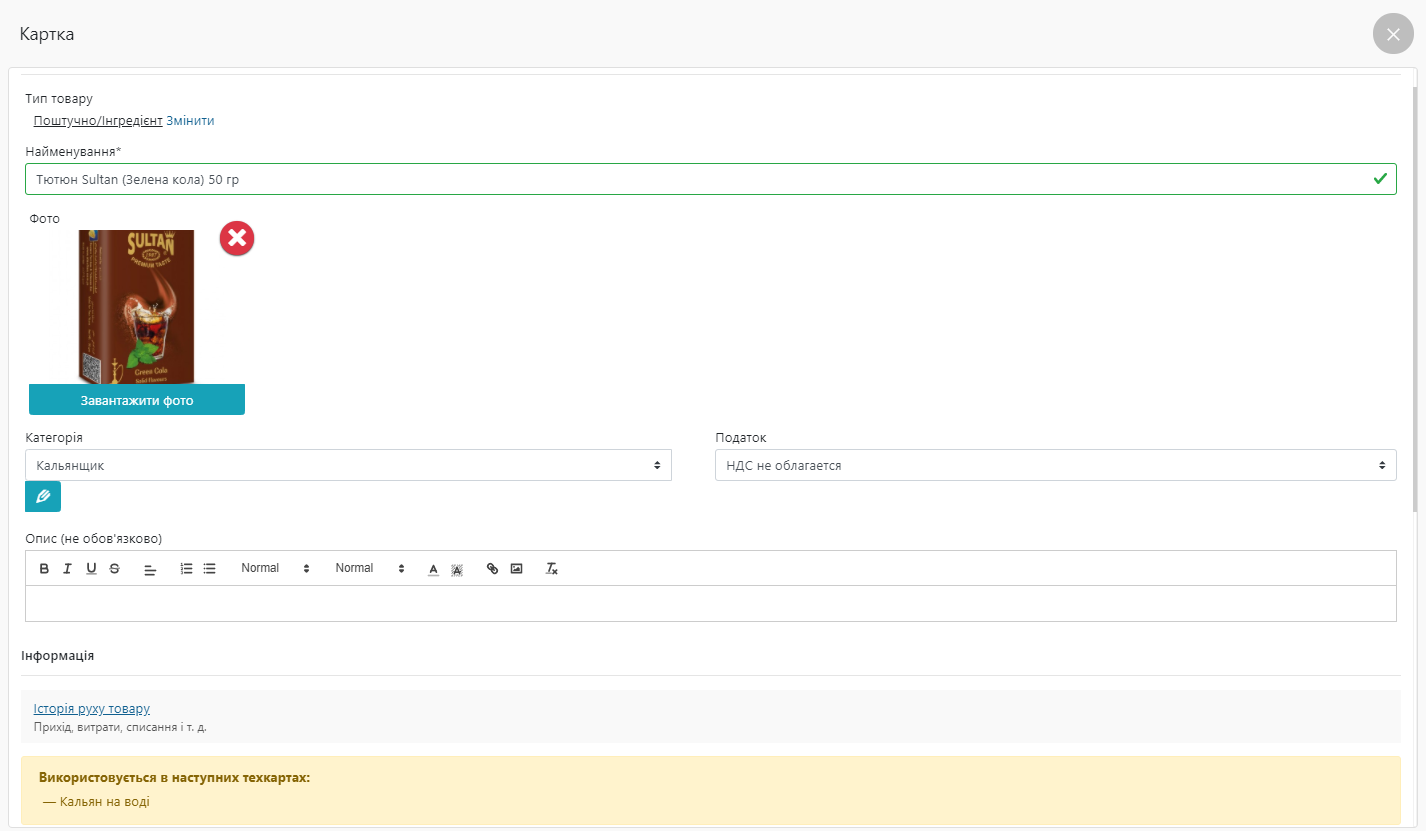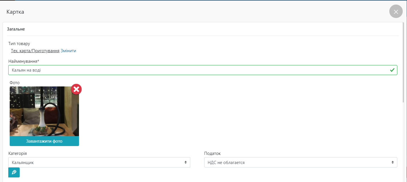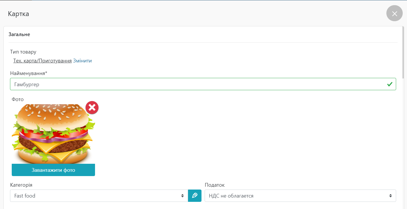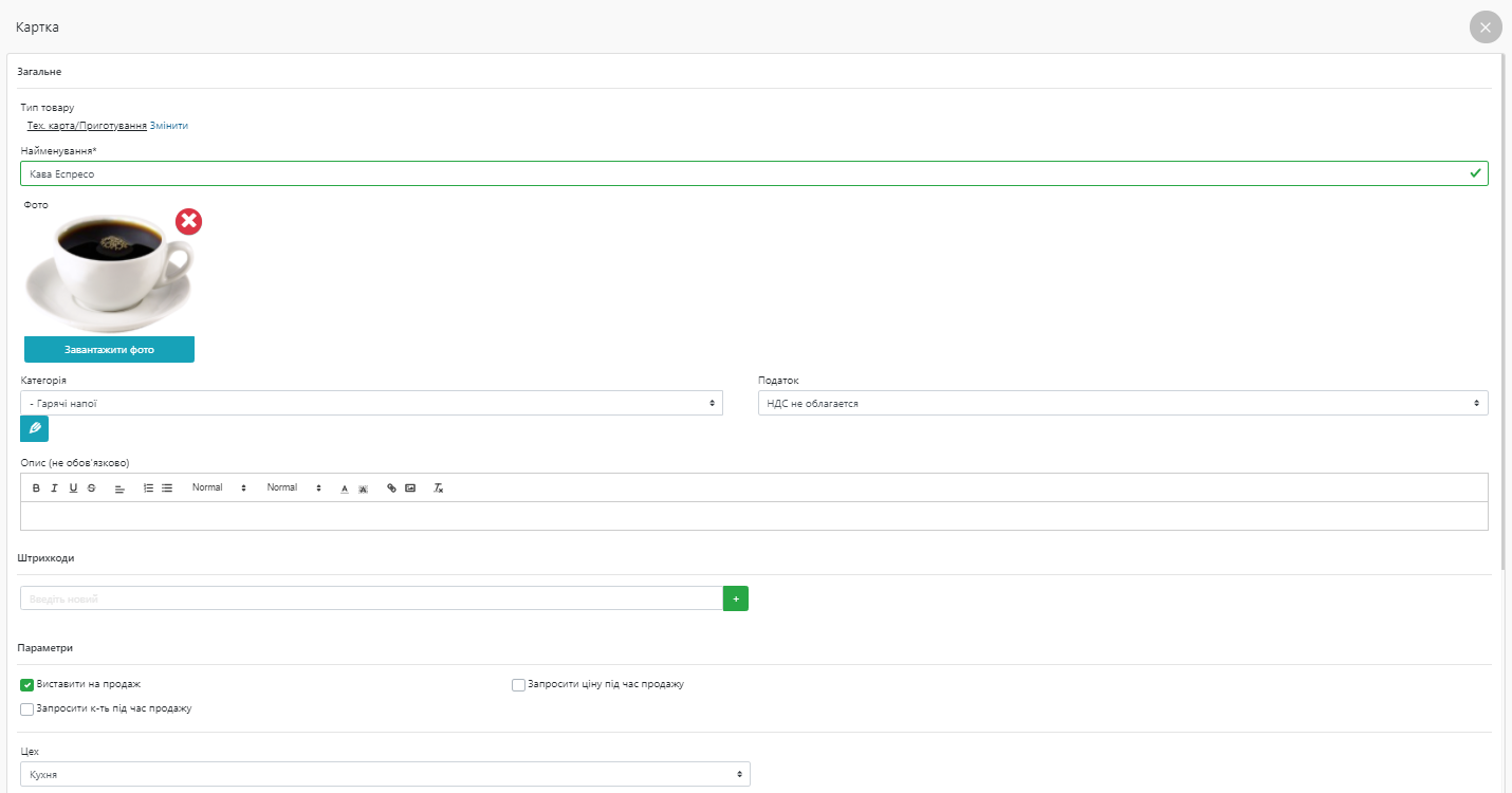 - Завантажте фотографію страви яка буде відображатись в Пос-терміналі і ставите галочку Виставити на продаж.