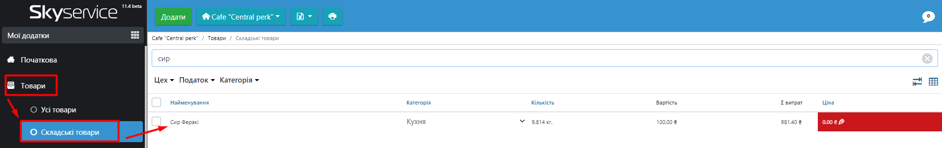 - Після додавання Інгредієнта, Ви можете побачити його на складі, натиснувши Товари – Складські товари.
