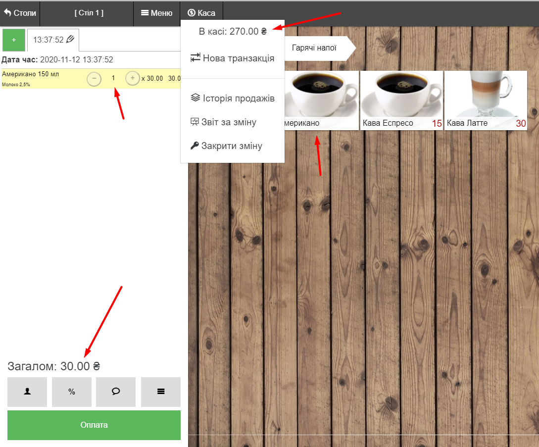 - Де можна побачити касу до операції 270.00, і сформований чек з підсумковою сумою.