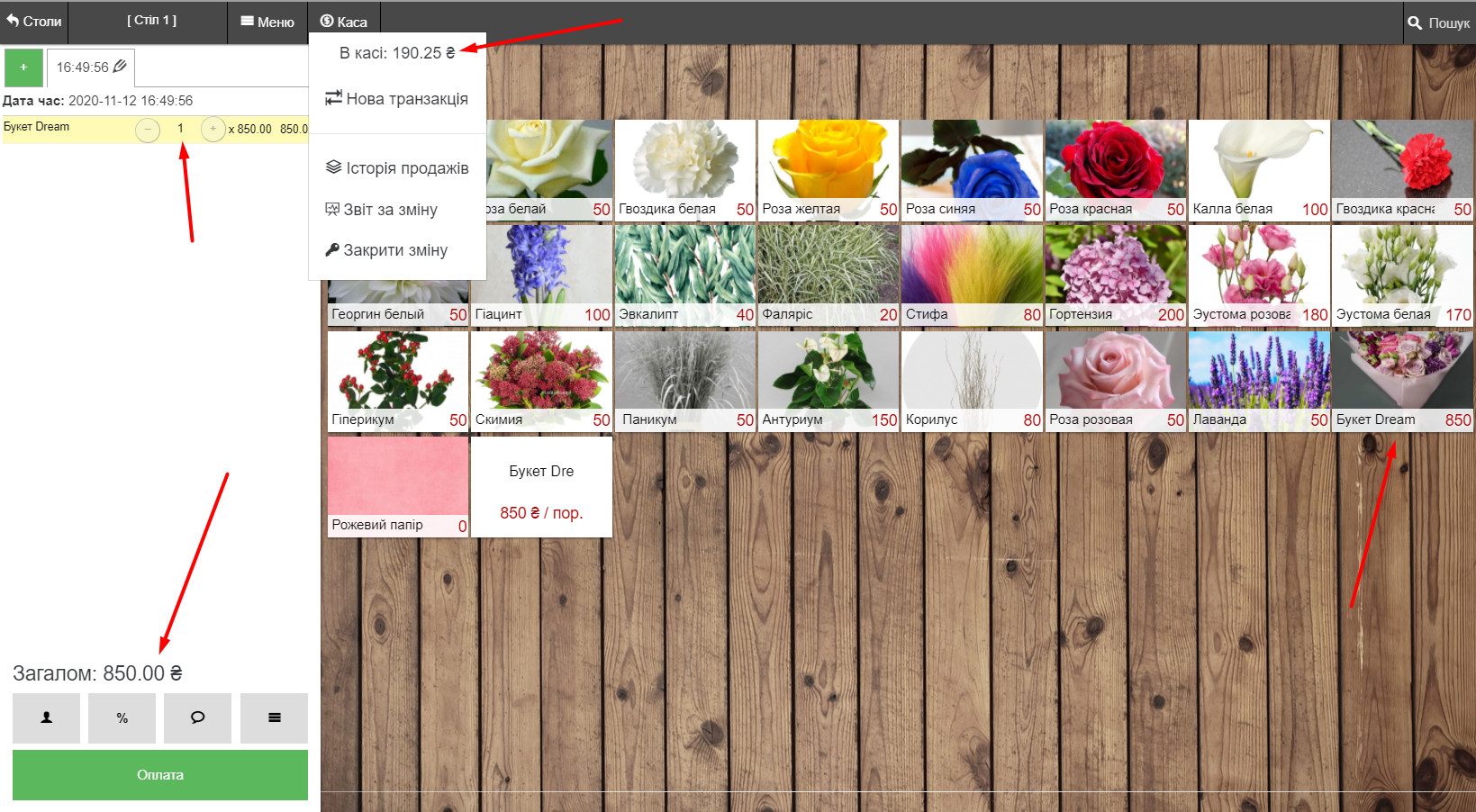 - Де можна побачити касу до операції 190.25, і сформований чек з підсумковою сумою.