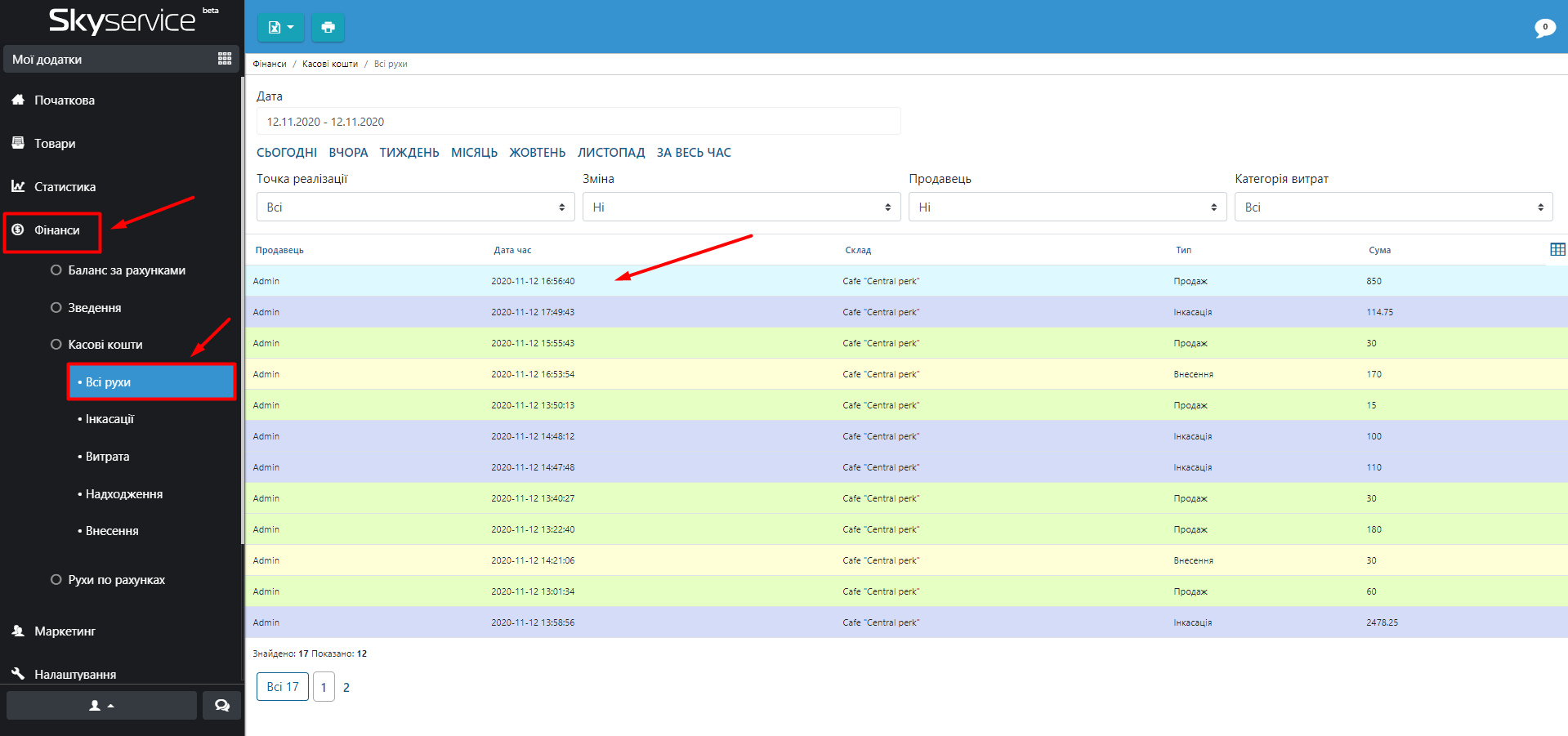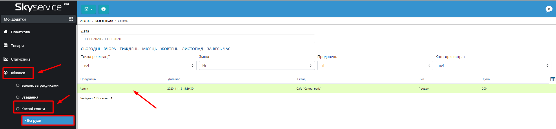 - Перейдіть в Меню–Адміністрування–Фінанси–Касові кошти–Всі рухи.