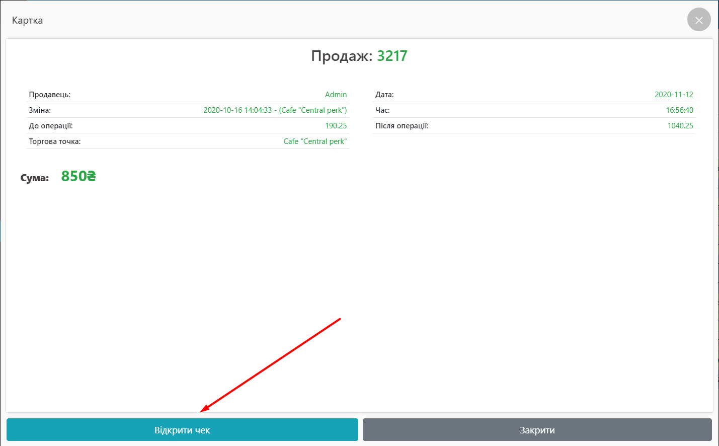 - Обираємо потрібний нам чек і можемо переглянути необхідну інформацію по даній продажі.