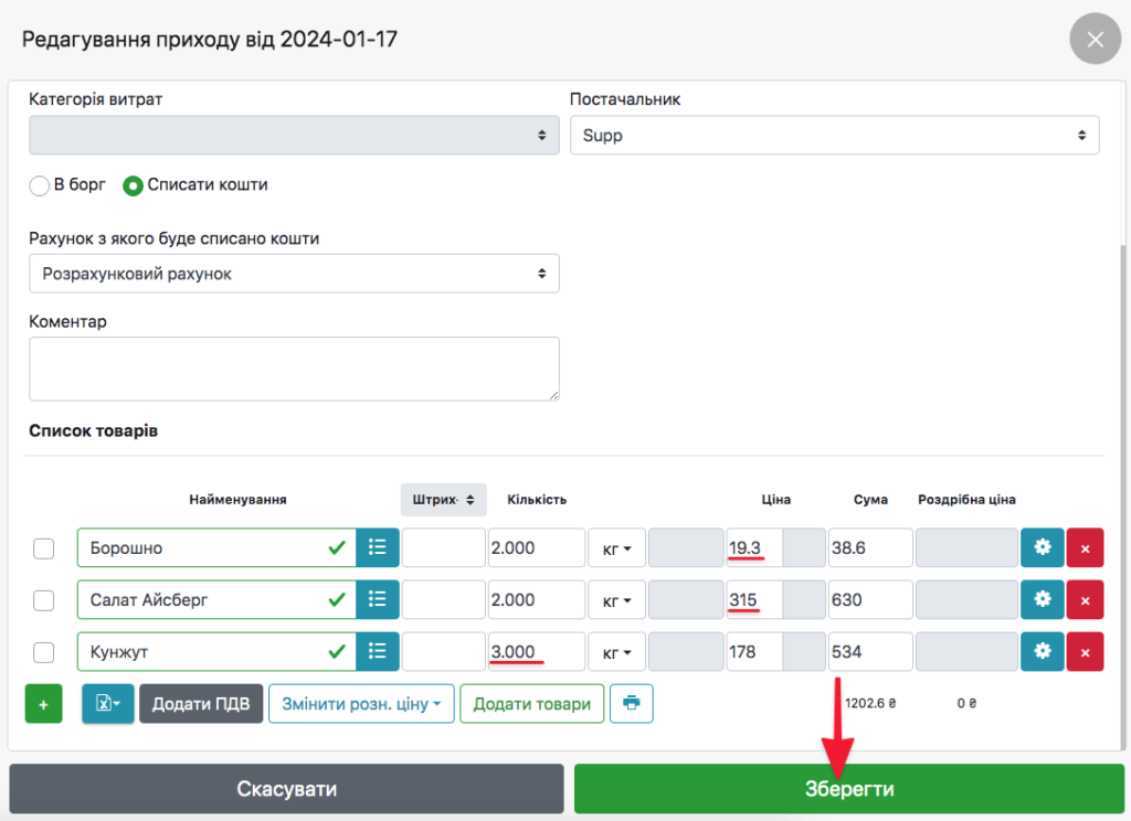 👉 Редагування документа Надходження товару буде обмежено у випадку, якщо було виконане Повернення товару постачальнику по даному документу.