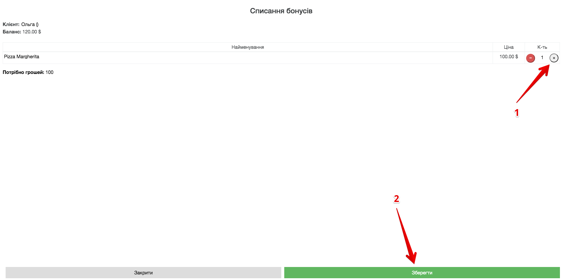 - У вікні Списання бонусів виберете кількість товару суму якого потрібно списати бонусами