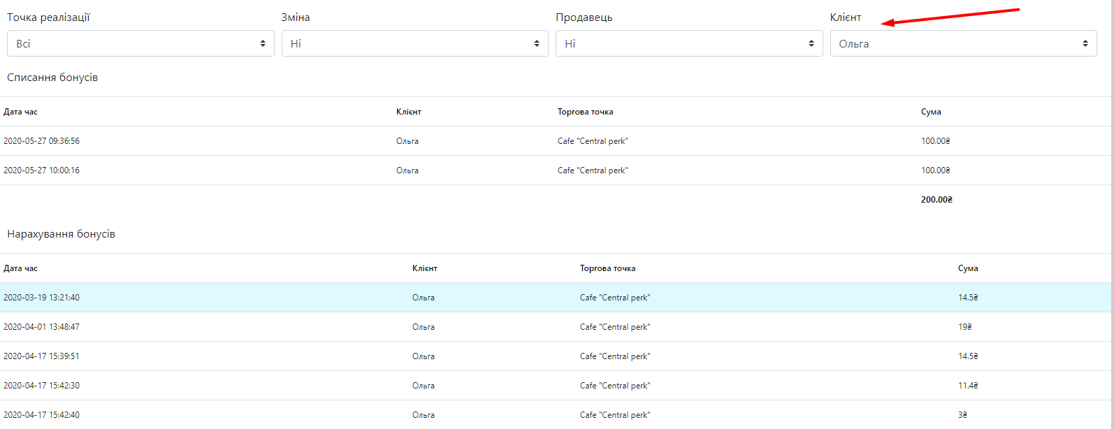 - Для того щоб прийняти оплату бонусами , в Pos-терміналі виберіть клієнта