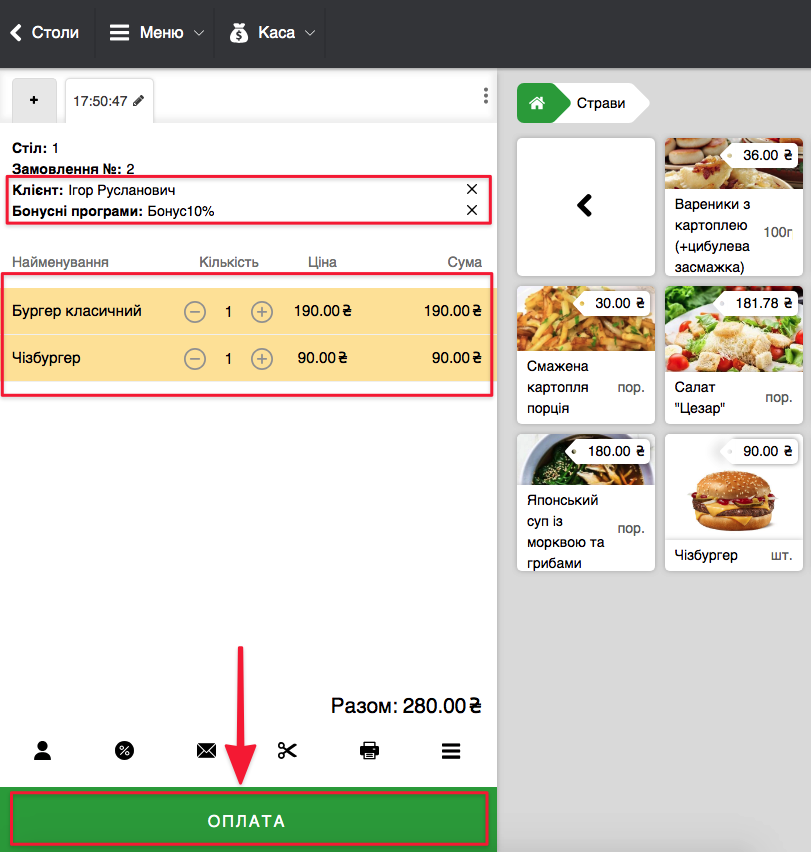 - Виберіть бонусну програму, клікнувши на іконку “%” знизу замовлення.