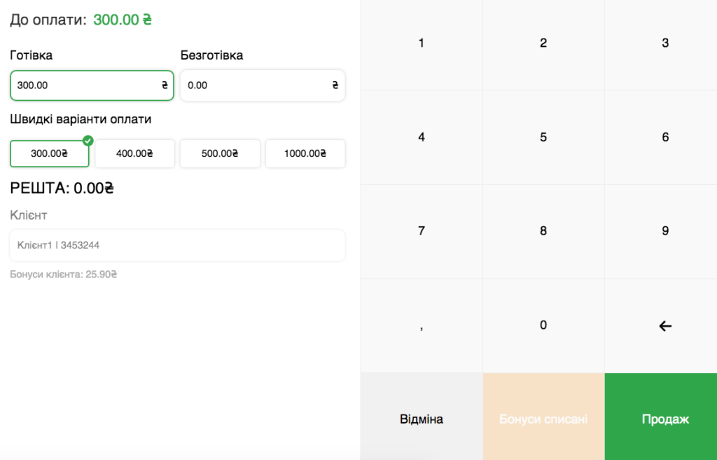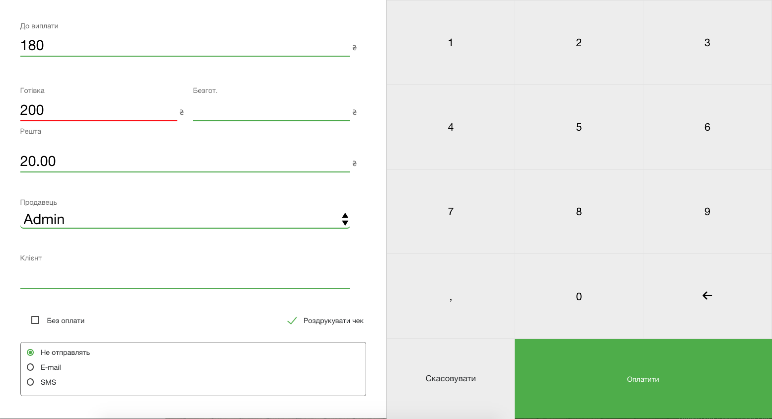 Приймайте оплату готівкою, карткою, бонусами, розділіть оплату на готівкову і картою
