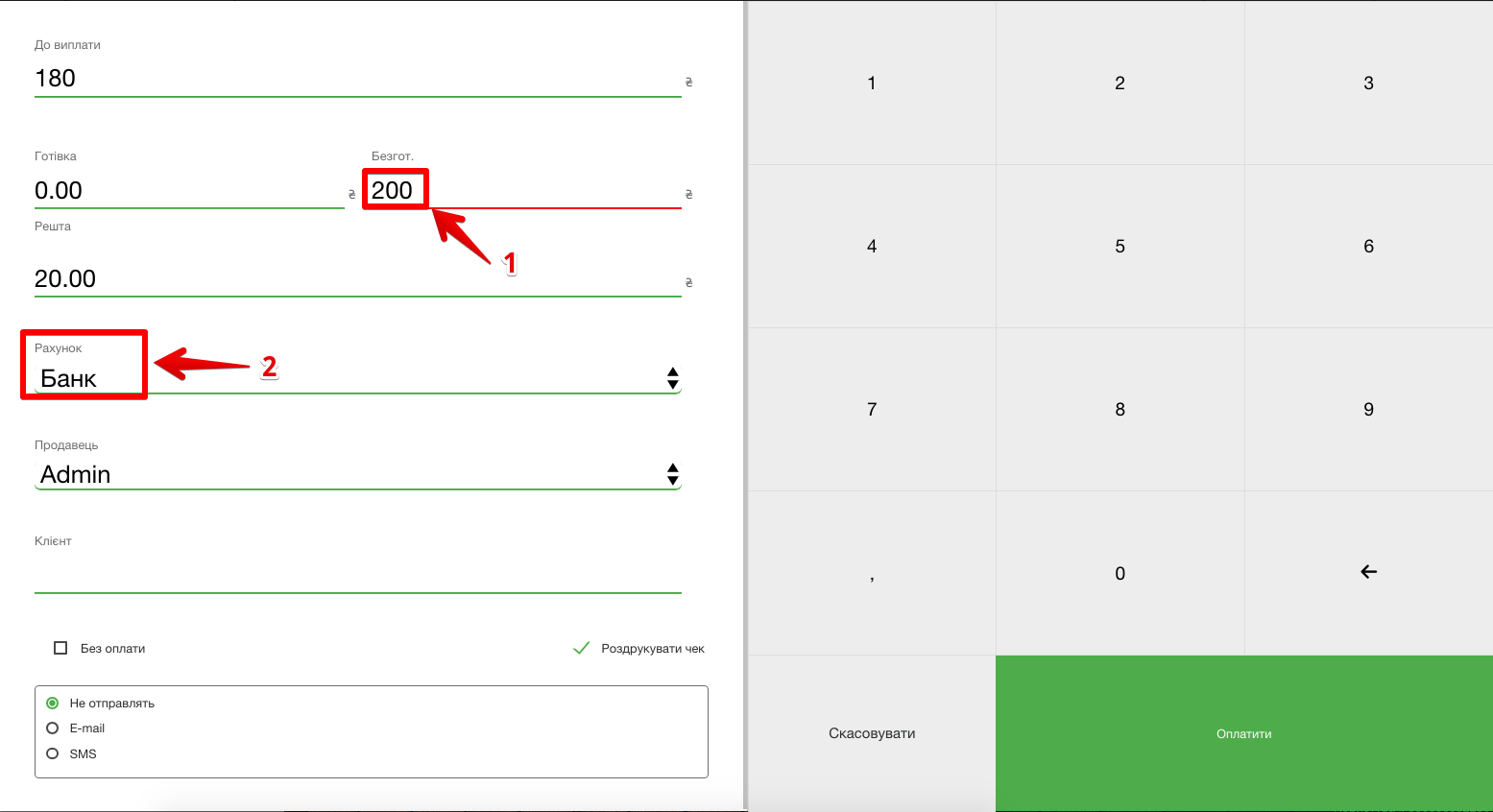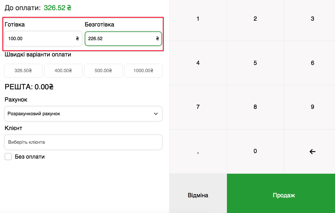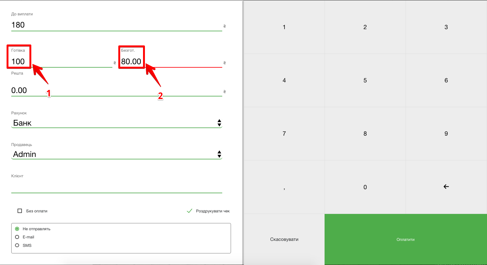 - Натисніть на поле Безготівка, залишок суми автоматично з’явиться в цьому полі