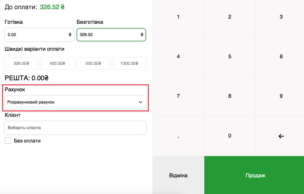 - ❗️ Поля вибору рахунку не буде, якщо у вас є налаштування на банківський термінал або емулятор → в такому випадку рахунок вже прив’язується до цього налаштування.