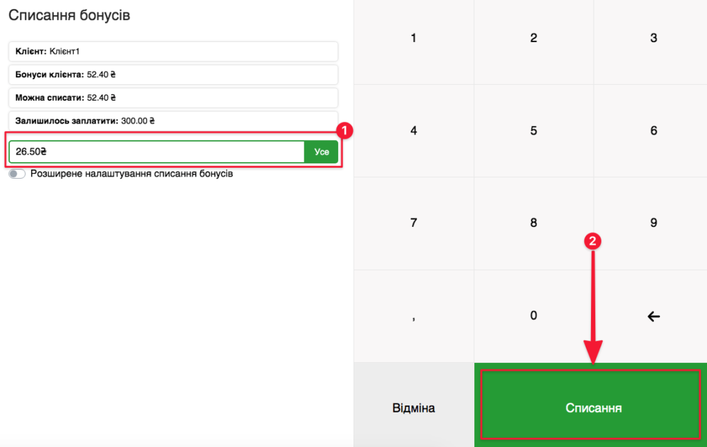 - У вікні Списання бонусів введіть суму, яку хочете списати з балансу клієнта