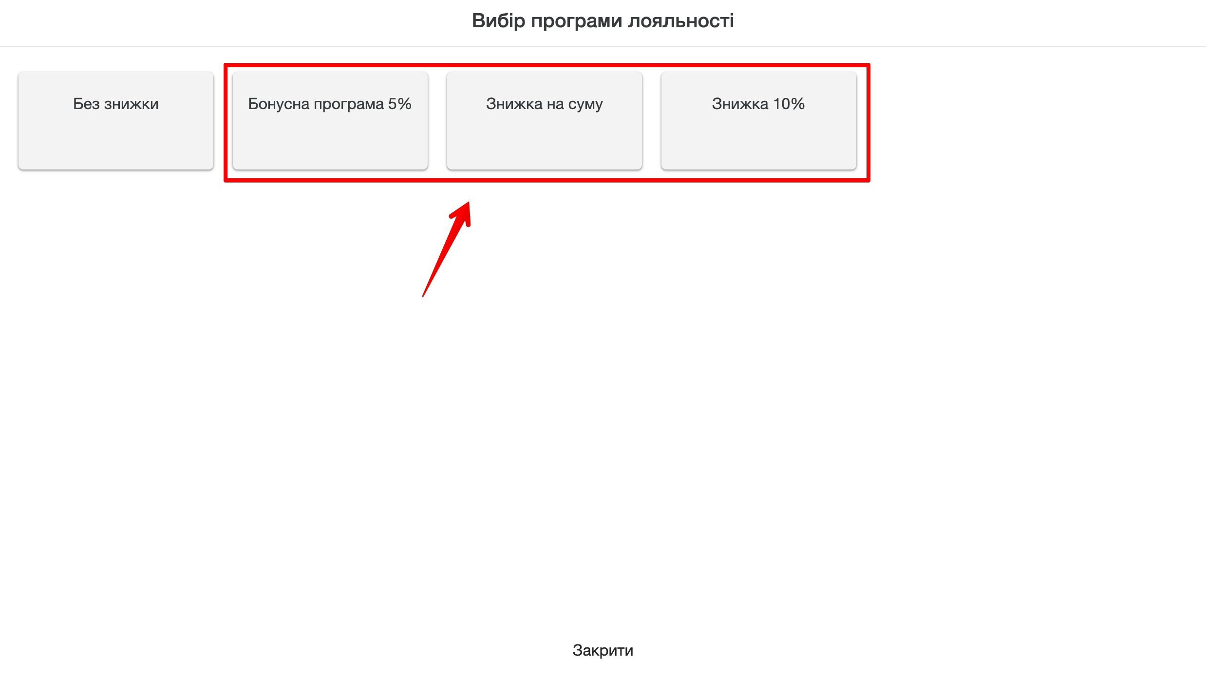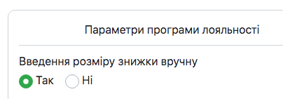☝️ Якщо у вас не відображається вибір Ручної знижки у POS-терміналі у вікні Програм лояльності, перевірте, щоб на вашому акаунті в Панелі Адміністрування → Налаштування → Каси в налаштуваннях робочої каси в блоці Параметри програми лояльності був обраний пункт “Так”. І навпаки “Ні”, якщо потрібно відключити таку можливість.