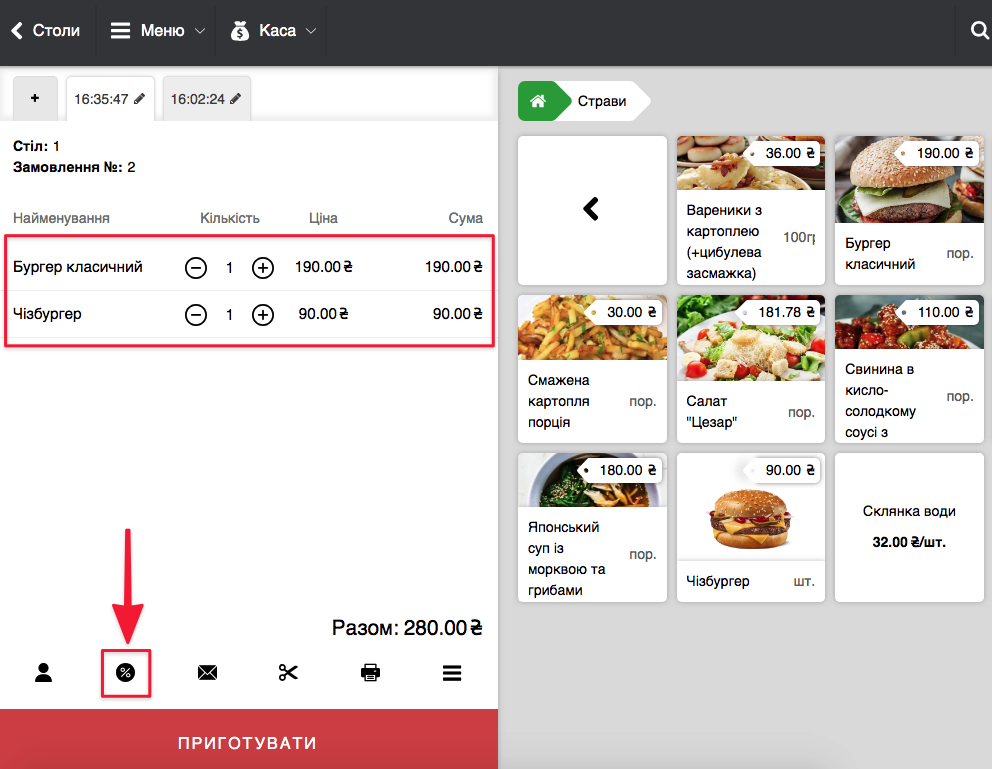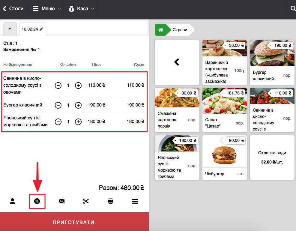 - У POS-терміналі на обрані Касі додайте товари до замовлення