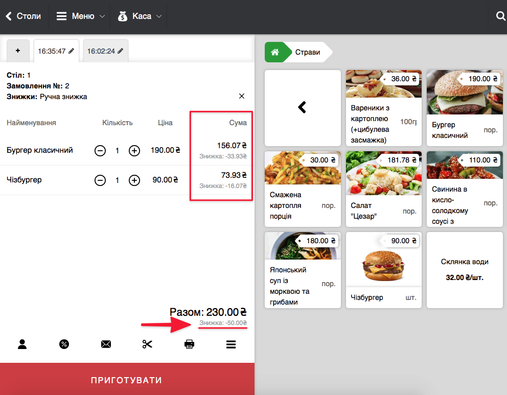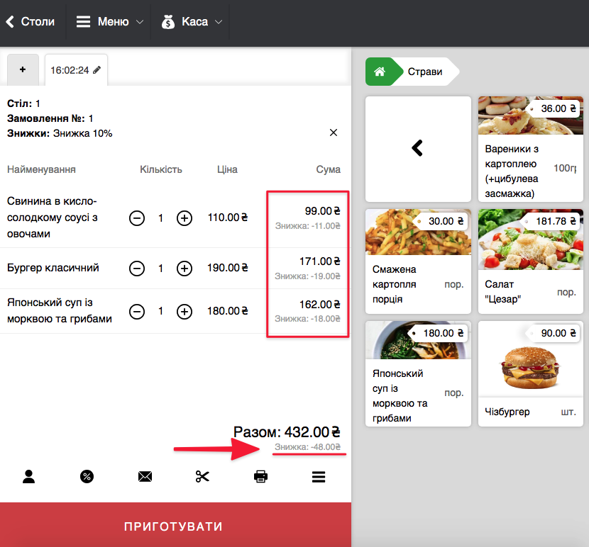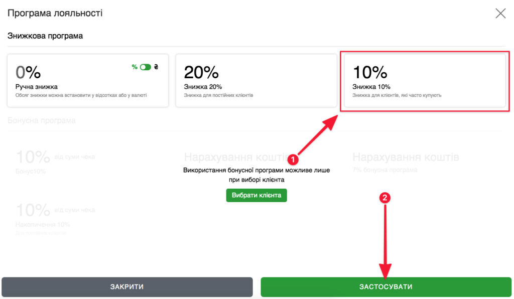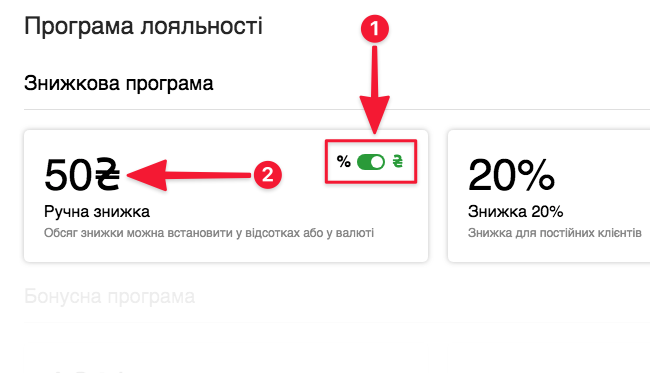 - Оберіть чи хочете застосувати знижку на відсоток від суми чеку чи на конкретну суму