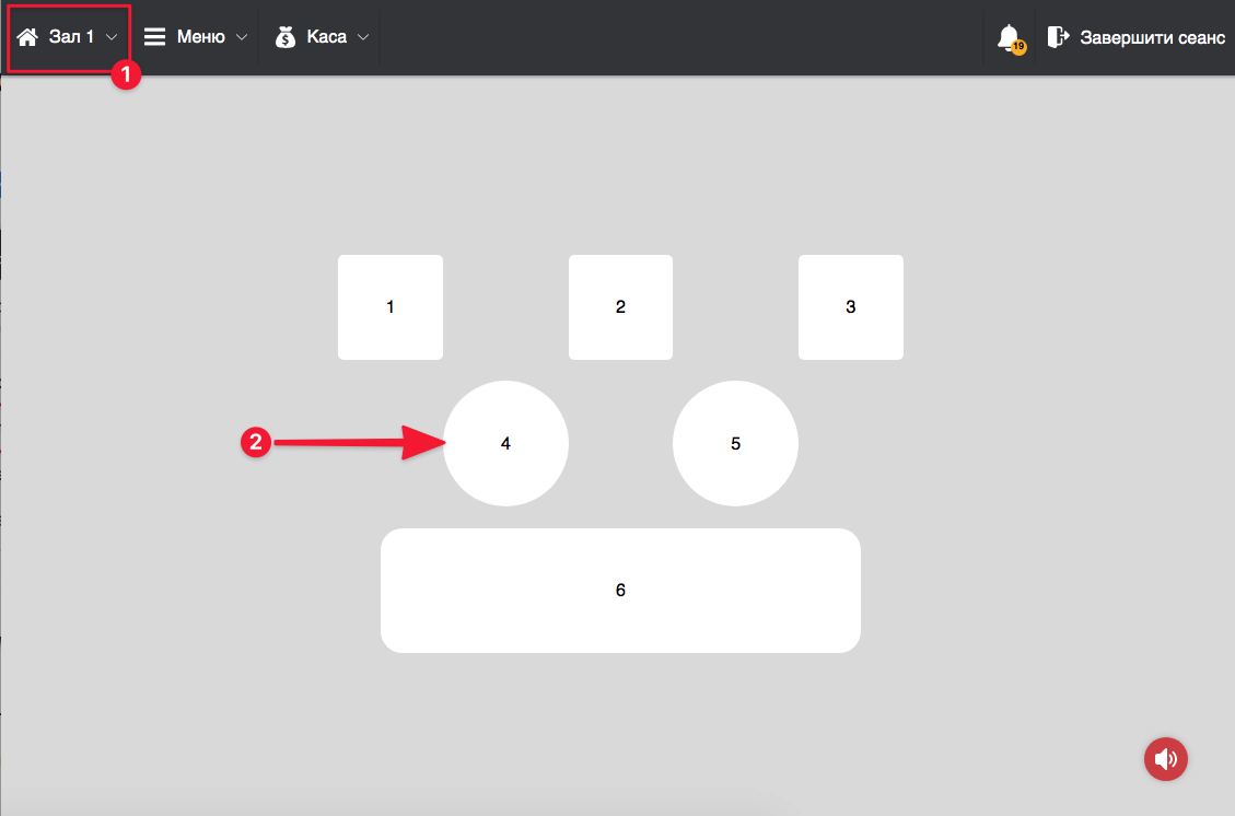 - В POS-терміналі на обраній касі оберіть зал, в якому знаходяться столи